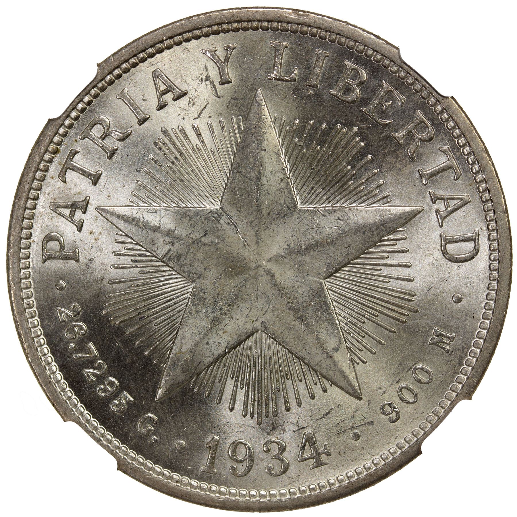 CUBA: First Republic, AR peso, 1934, KM-15.2, Star type, brilliant white luster, shield and other details well struck, NGC graded MS64.