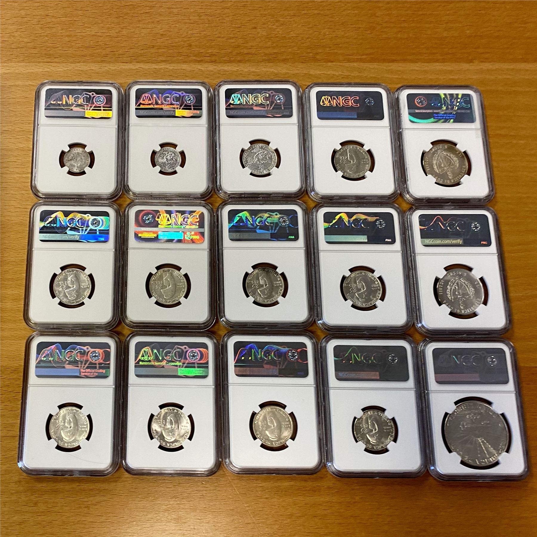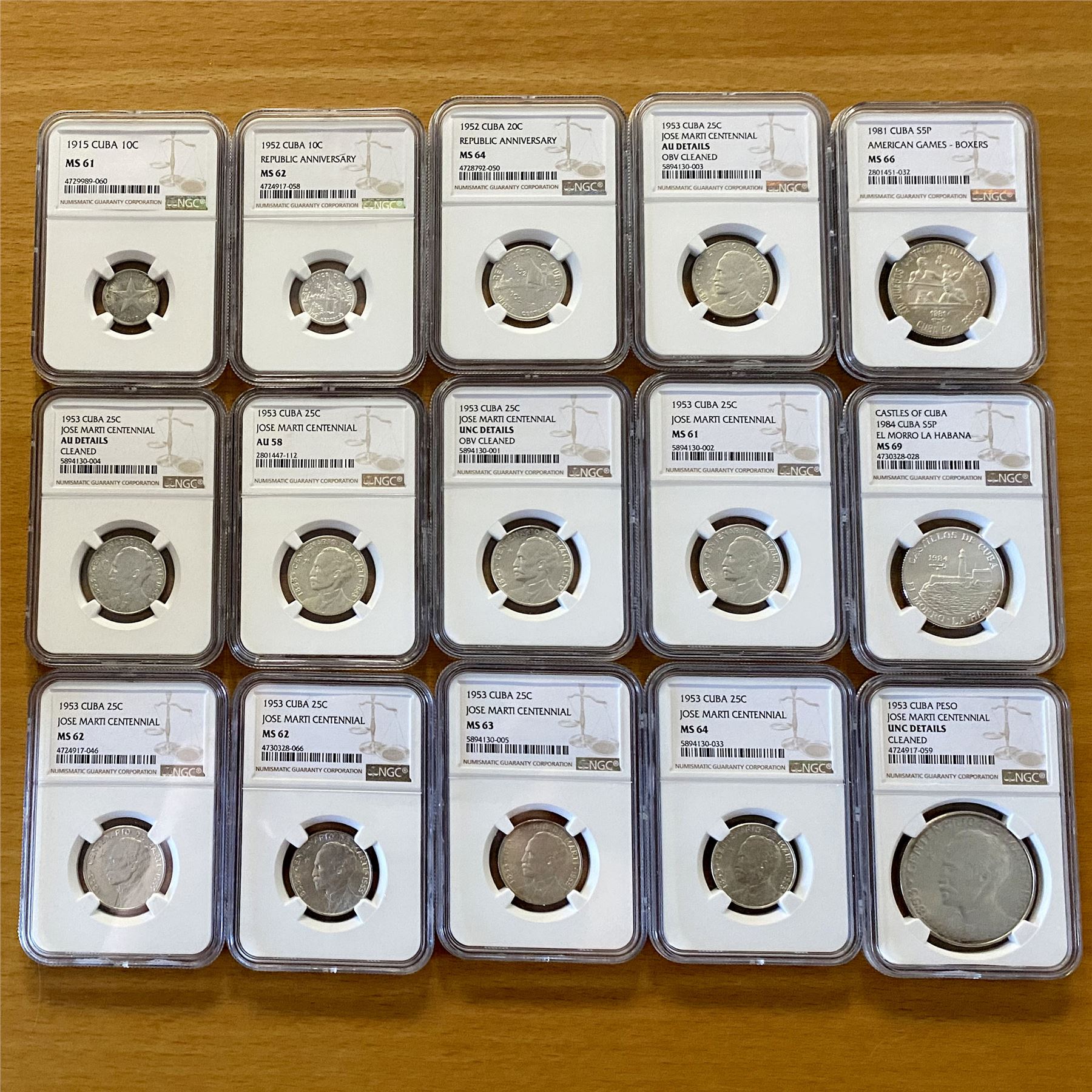 CUBA: LOT of 15 certified coins, all NGC-certified, all silver, including 10 centavos: 1915 MS 61 and 1952 MS 62; 20 centavos: 1952 MS 64; 25 centavos (all 1953): AU details obverse cleaned, AU details cleaned, AU 58, Unc details obverse cleaned, MS 61, MS 62 (2 pcs), MS 63, and MS 64; peso: 1953 Unc details cleaned; and 5 pesos: 1981 KM-81 MS 66 and 1984 KM-141 MS 69; retail value $550, lot of 15 slabs.