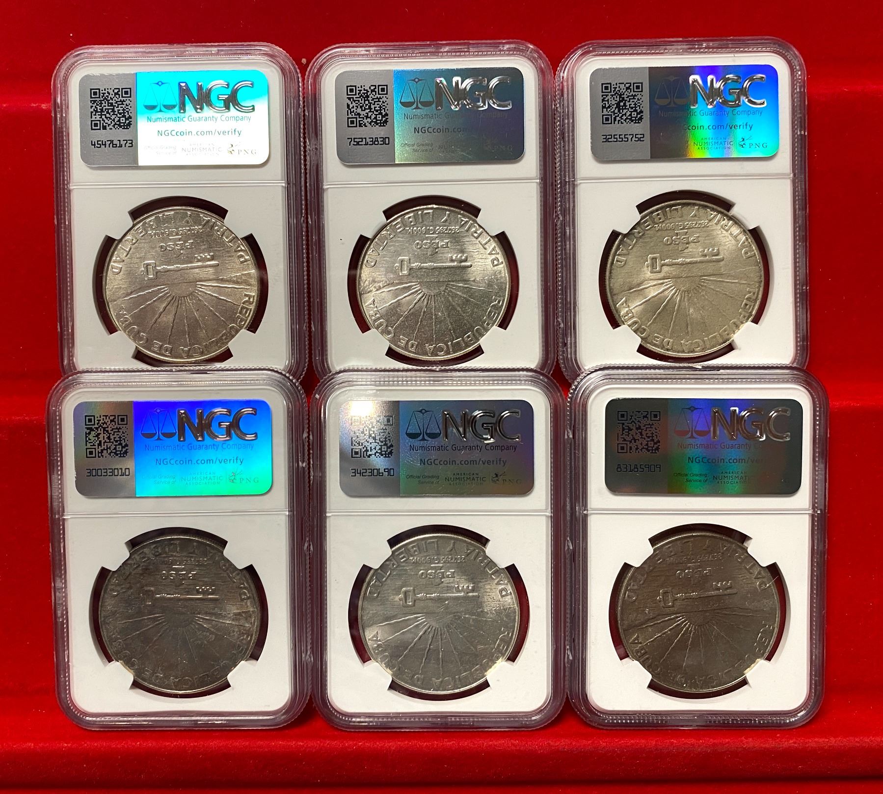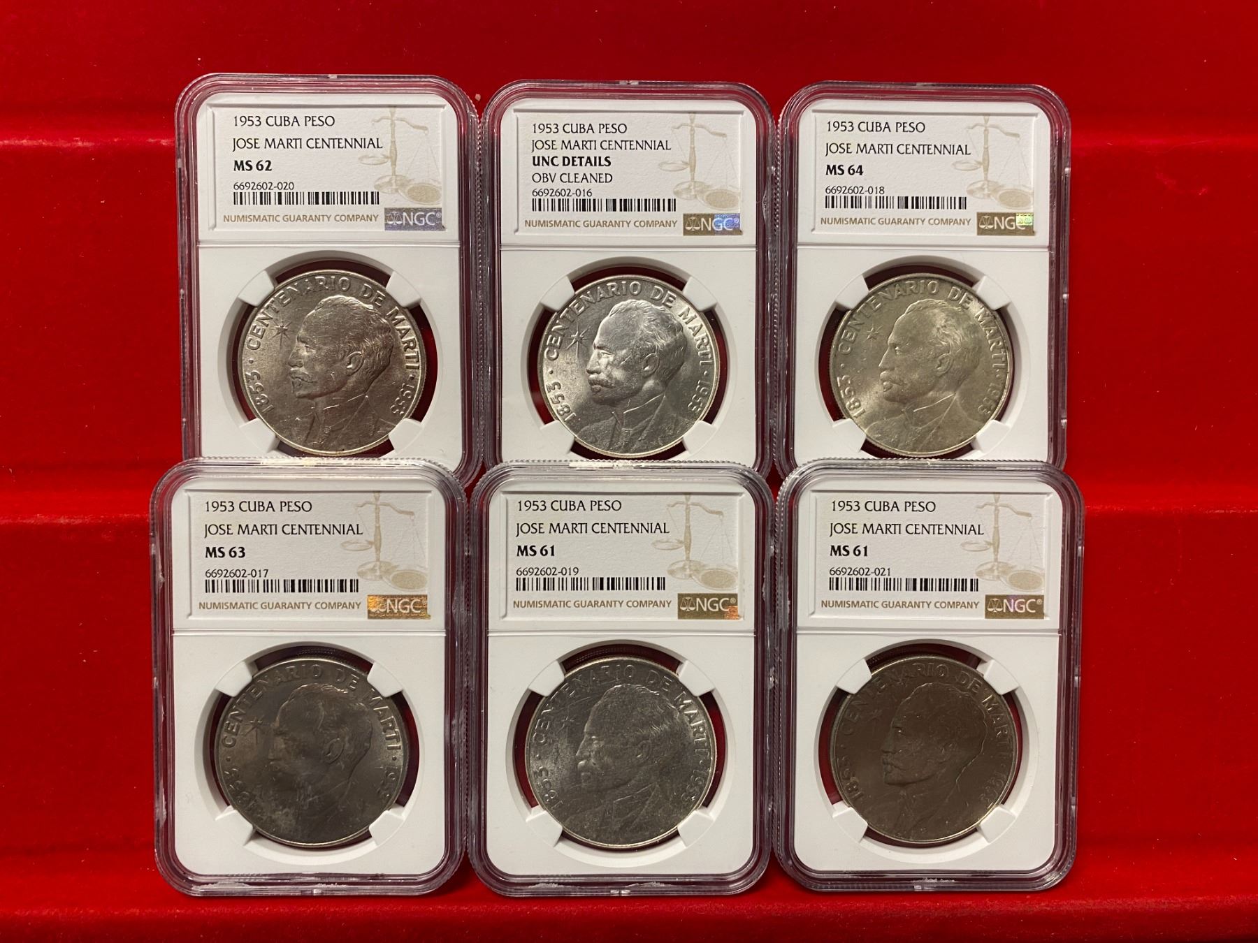 CUBA: LOT of 6 coins, group of silver peso, all NGC graded, 1953, KM-29, Philadelphia Mint, 100th Anniversary of José Martí, including MS-61 (2), MS-62, MS-63, MS-64, and UNC details, a lovely group of this popular commemorative type, retail value $500, lot of 6 coins. Design based upon the upper central portion of the Cuban coat of arms: Radiant sun rising over sea with key in foreground. Name of the country below, face value, technical data and motto above.