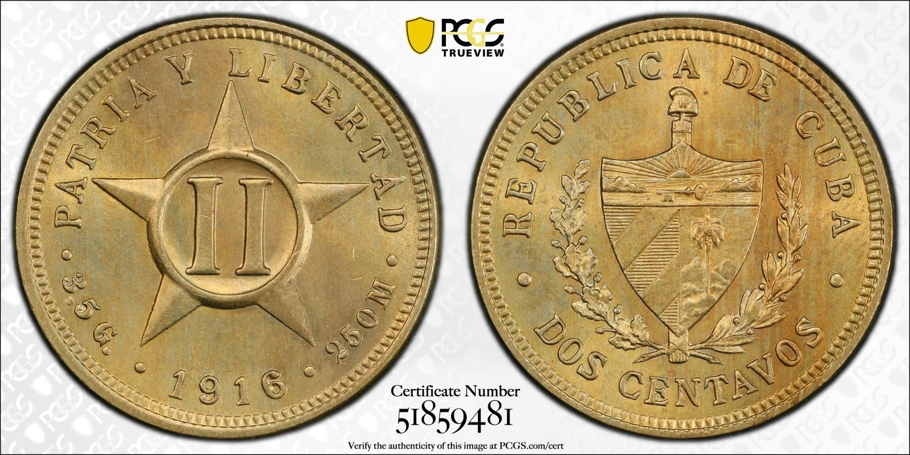 CUBA: Republic, 2 centavos, 1916, KM-A10, Y-4, a superb example, PCGS graded MS65, ex Almer H. Orr III Collection.