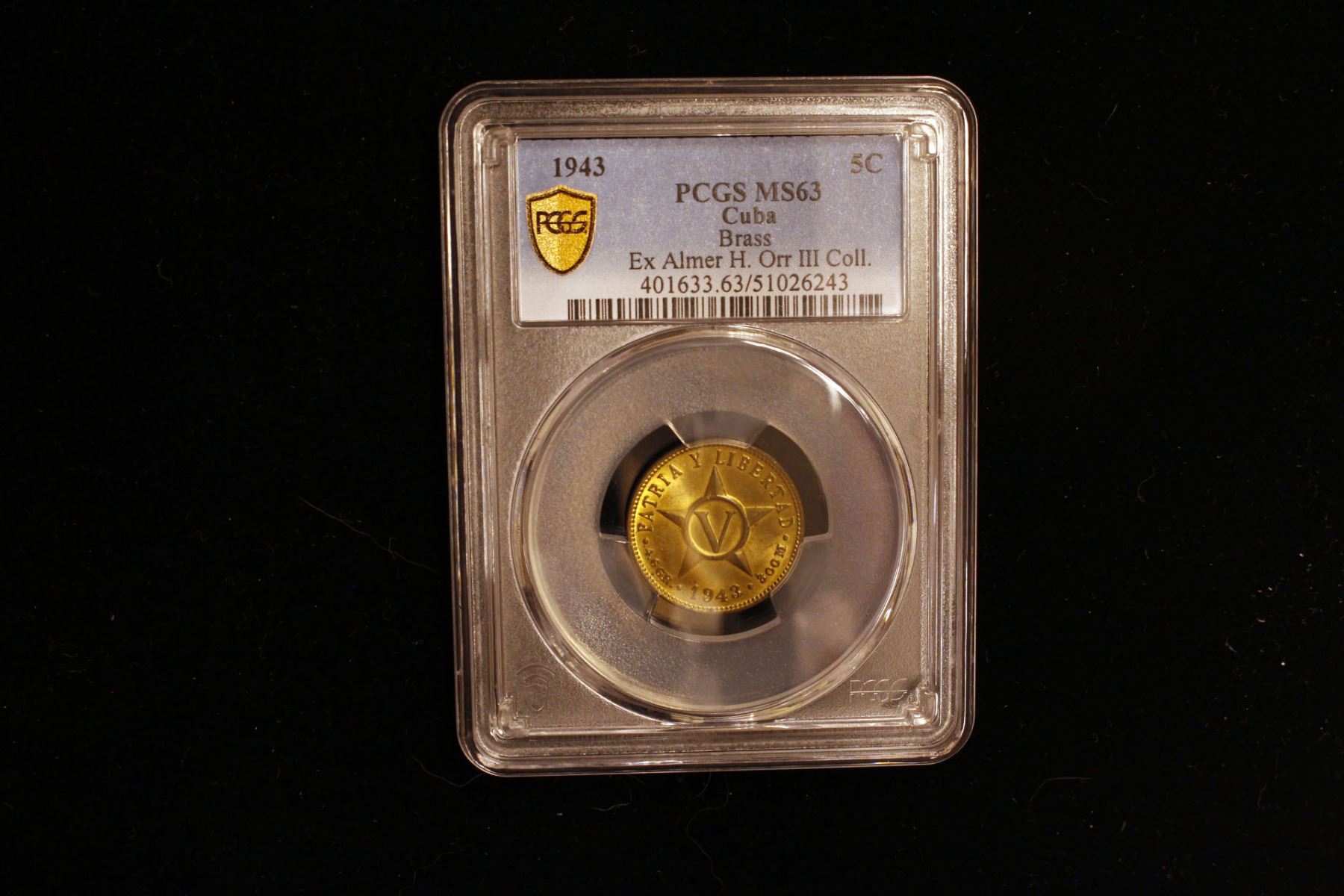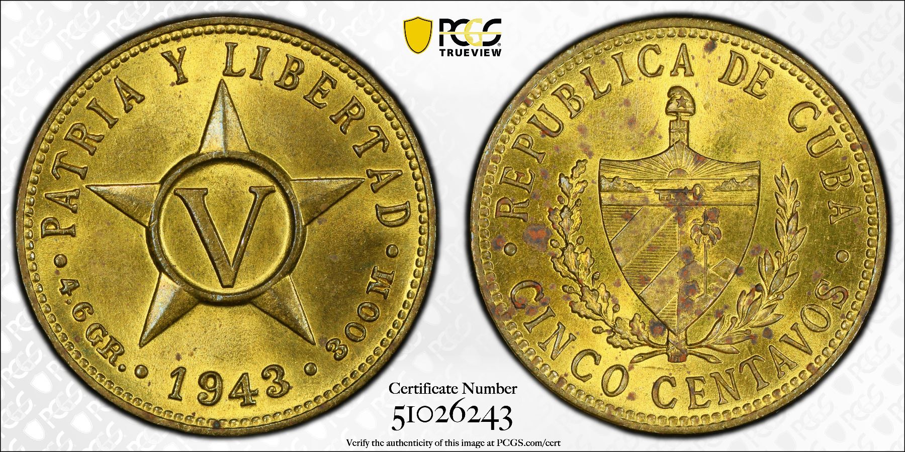 CUBA: Republic, 5 centavos, 1943, KM-11a, a lovely example, PCGS graded MS63, ex Almer H. Orr III Collection.