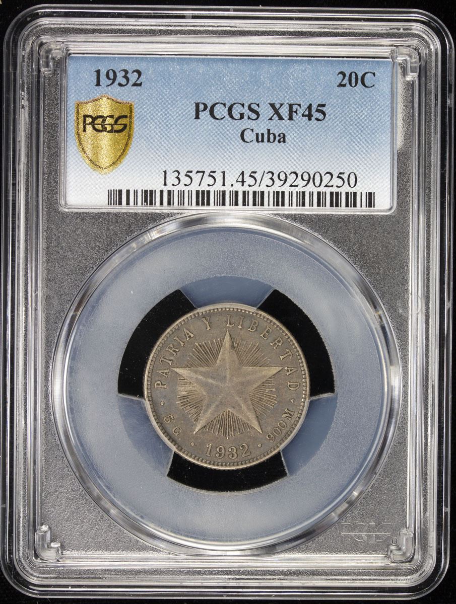 CUBA: Republic, AR 20 centavos, 1932, KM-13, PCGS graded EF45.