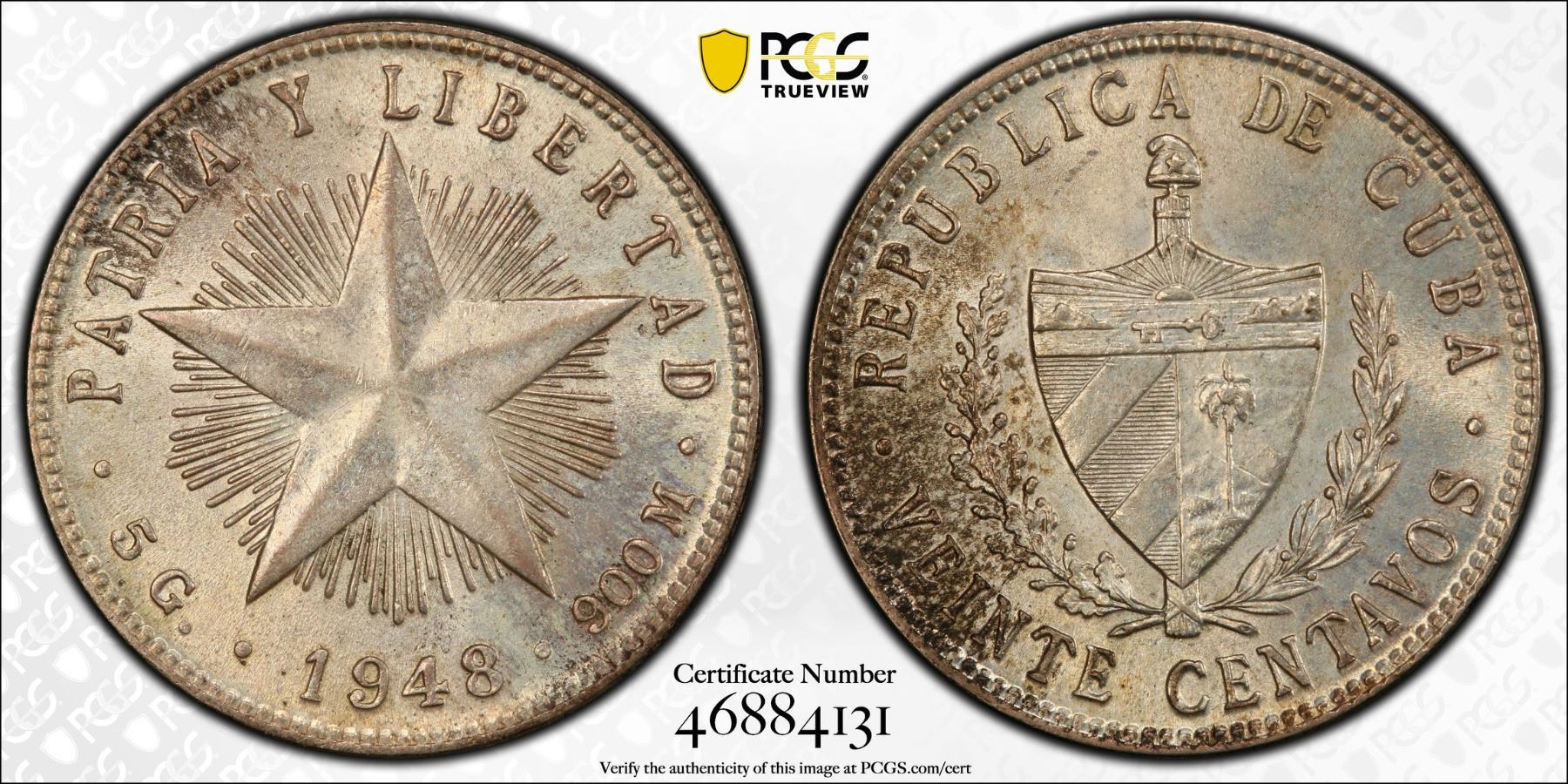 CUBA: Republic, AR 20 centavos, 1948, KM-13, Y-7, a wonderful lustrous example! PCGS graded MS64.