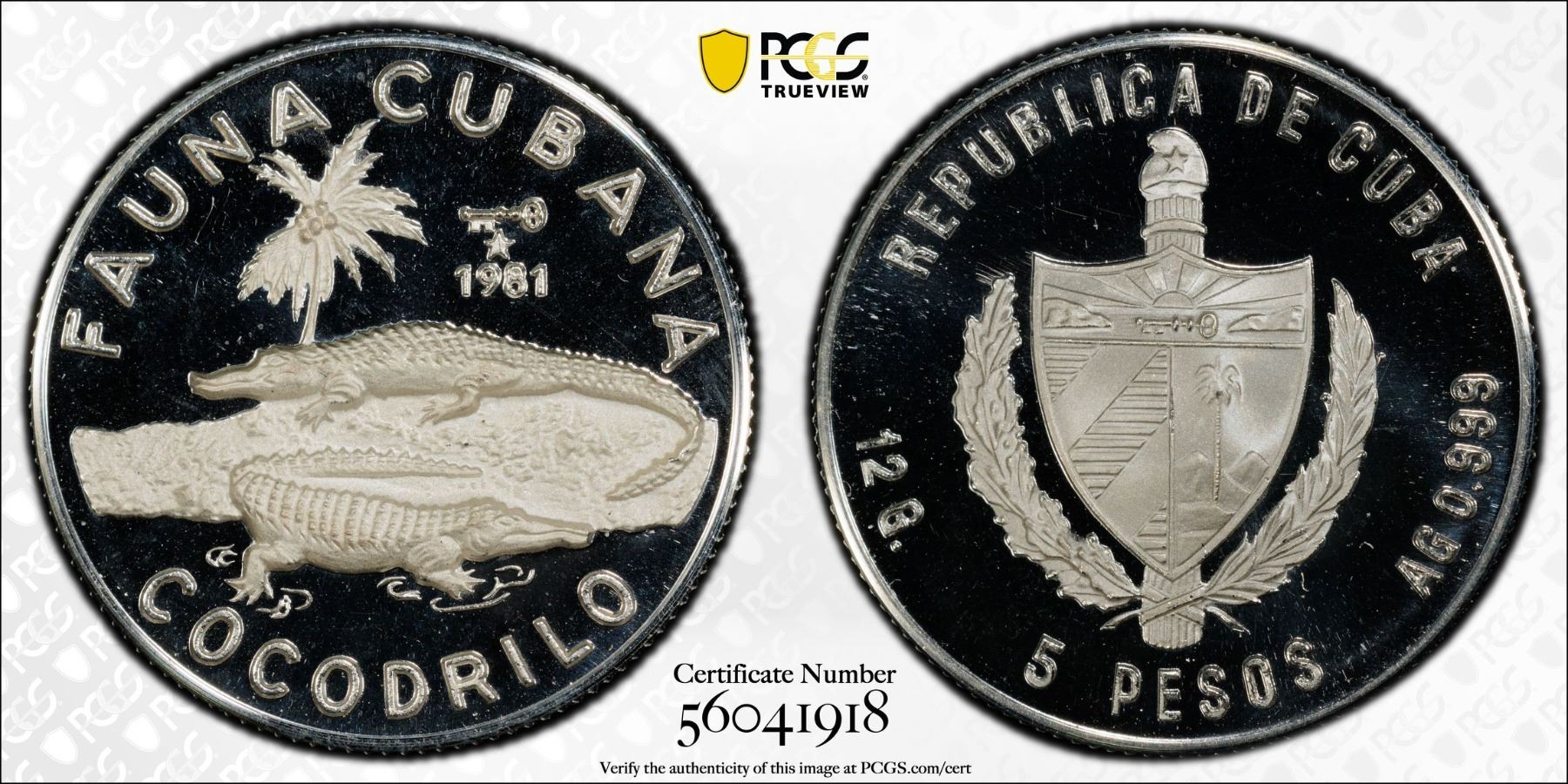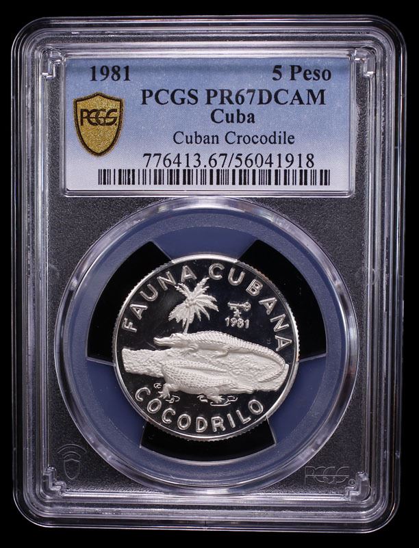 CUBA: Republic, AR 5 pesos, 1981, KM-74, Cuban Fauna series, Cuban Crocodile, an incredible example, PCGS graded PF67 Deep Cameo.