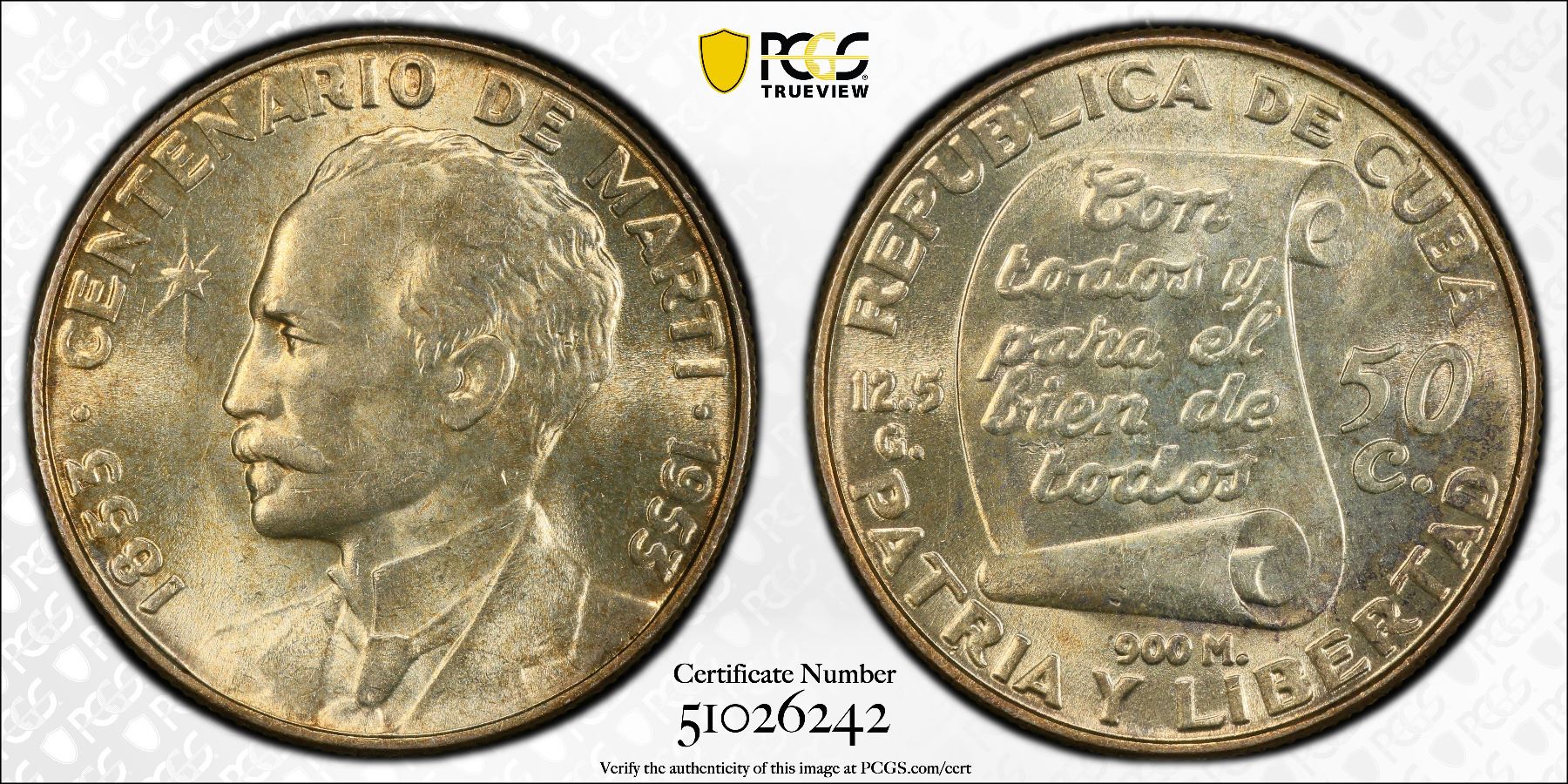CUBA: Republic, AR 50 centavos, 1953, KM-28, a lovely example, PCGS graded MS63, ex Almer H. Orr III Collection.