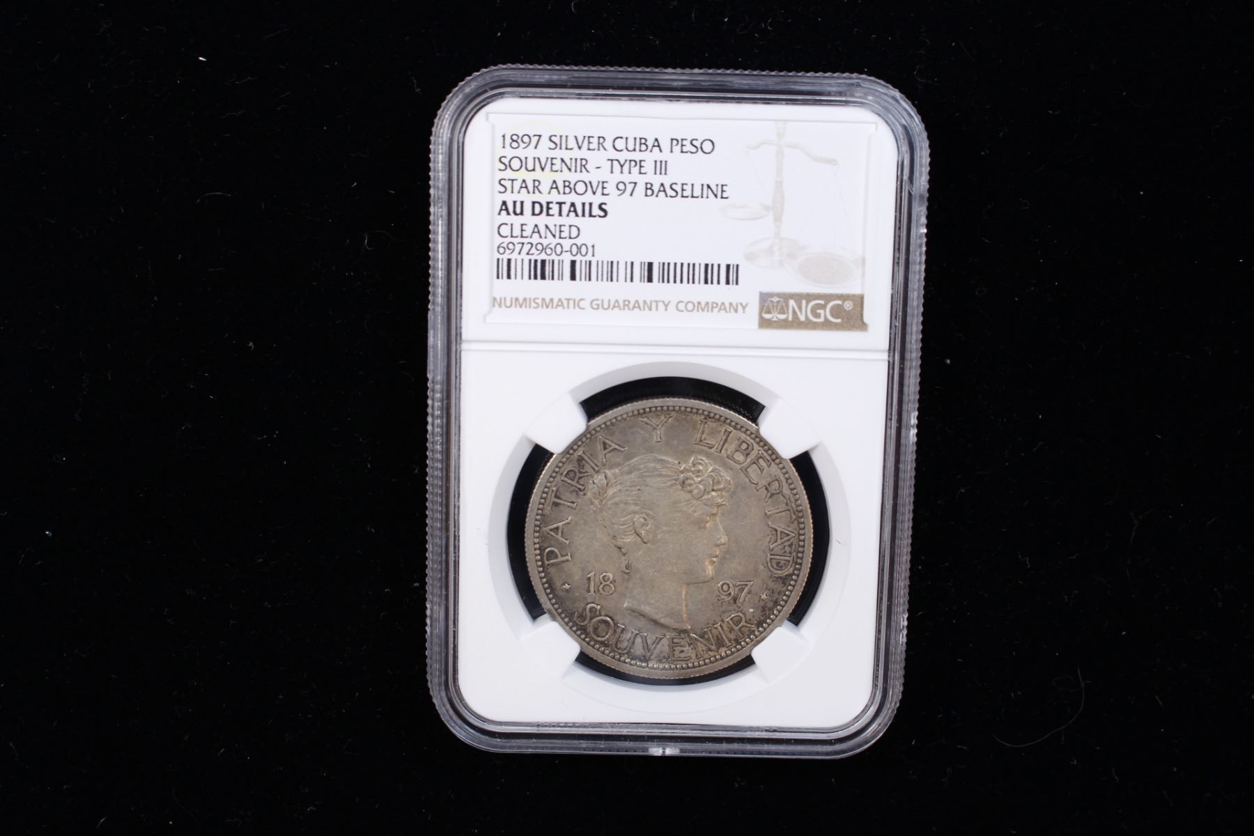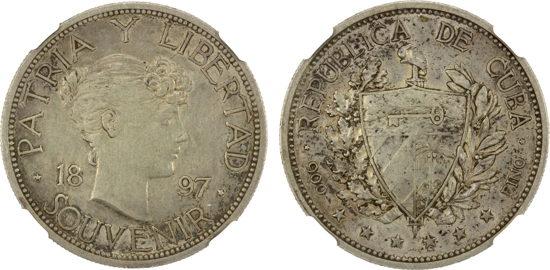 CUBA: Republic, AR souvenir peso, 1897, KM-M3, Type III, with date closely spaced and star above the 97 baseline, light cleaned, NGC graded AU details. The souvenir pesos were designed by Philip Martiny and produced in the United States to raise money for Cuba's struggle for independence. They were struck by the Gorham Manufacturing Co. of Providence, Rhode Island. The reverse image represents the Republic, and is based on a portrait of Leonor Molina Adán, cousin of José Zayas, Treasury Delegate of the Revolutionary Movement, and also an active member of the group. Known as the "Souvenir Peso", the three types from 1897 (and their respective patterns) were part of the coins minted to contribute to funds of the Movement, as well as the 1 peso minted in 1898.