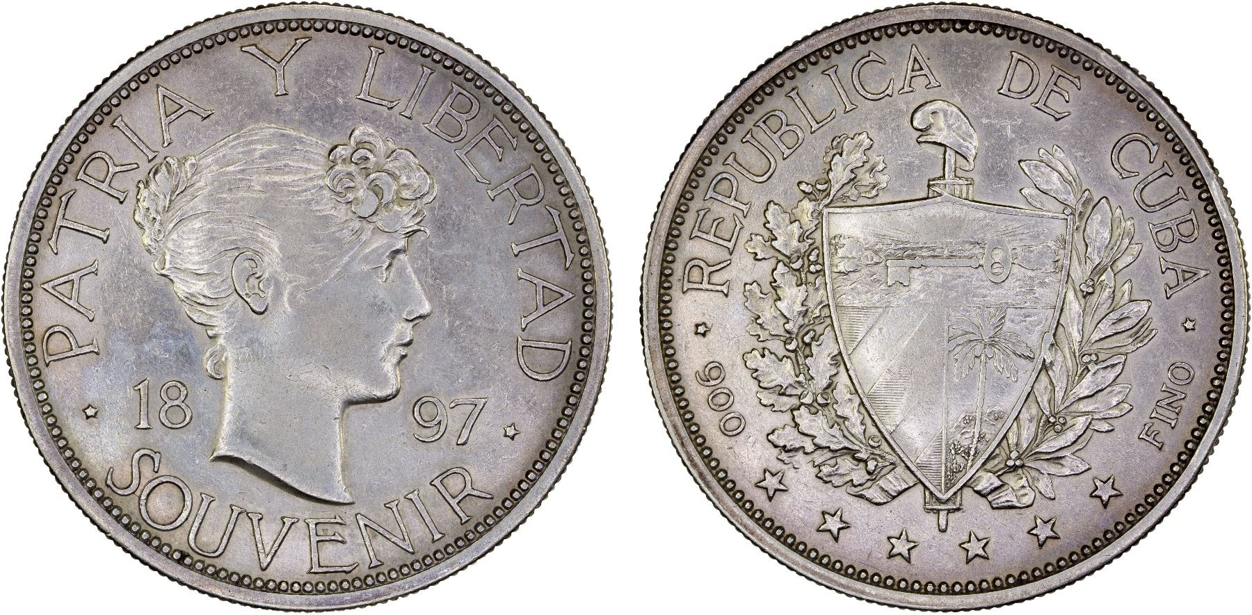 CUBA: Republic, AR souvenir peso, 1897, KM-M3, Type III, with date closely spaced and star above the 97 baseline, lightly cleaned, XF. Designed by Philip Martiny and produced in the United States to raise money for Cuba's struggle for independence. Struck by the Gorham Manufacturing Co. of Providence, Rhode Island. The reverse image represents the Republic, and is based on a portrait of Leonor Molina Adán, cousin of José Zayas, Treasury Delegate of the Revolutionary Movement, and also an active member of the group. Known as the "Souvenir Peso", the three types from 1897 (and their respective patterns) were part of the coins minted to contribute to funds of the Movement, as well as the 1 peso minted in 1898.