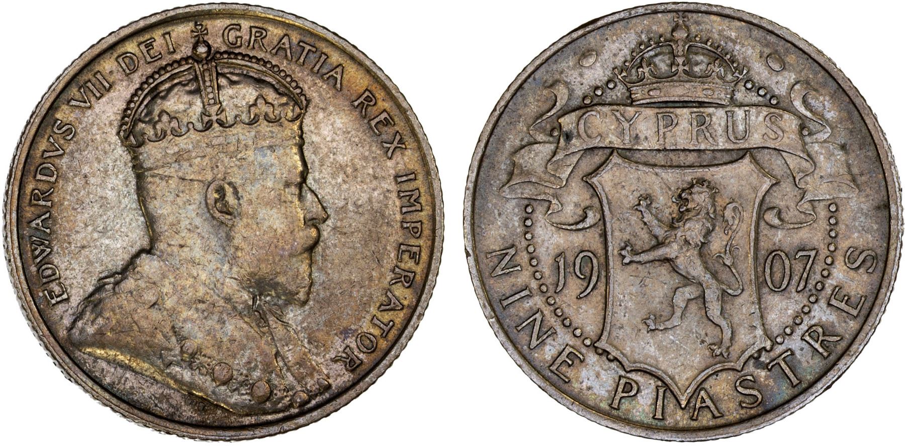 CYPRUS: British Colony, AR 9 piastres, 1907, KM-9, nice original tone, some luster, VF-XF.