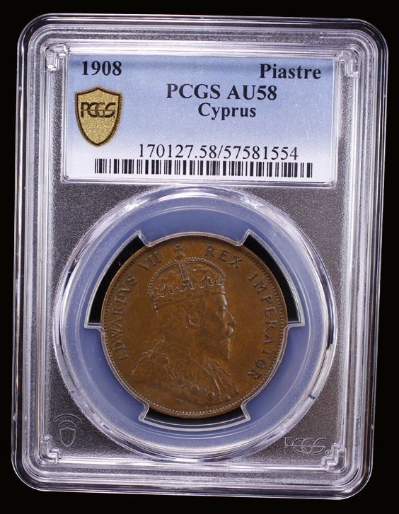 CYPRUS: Edward VII, 1901-1910, AE piastre, 1908, PCGS AU58