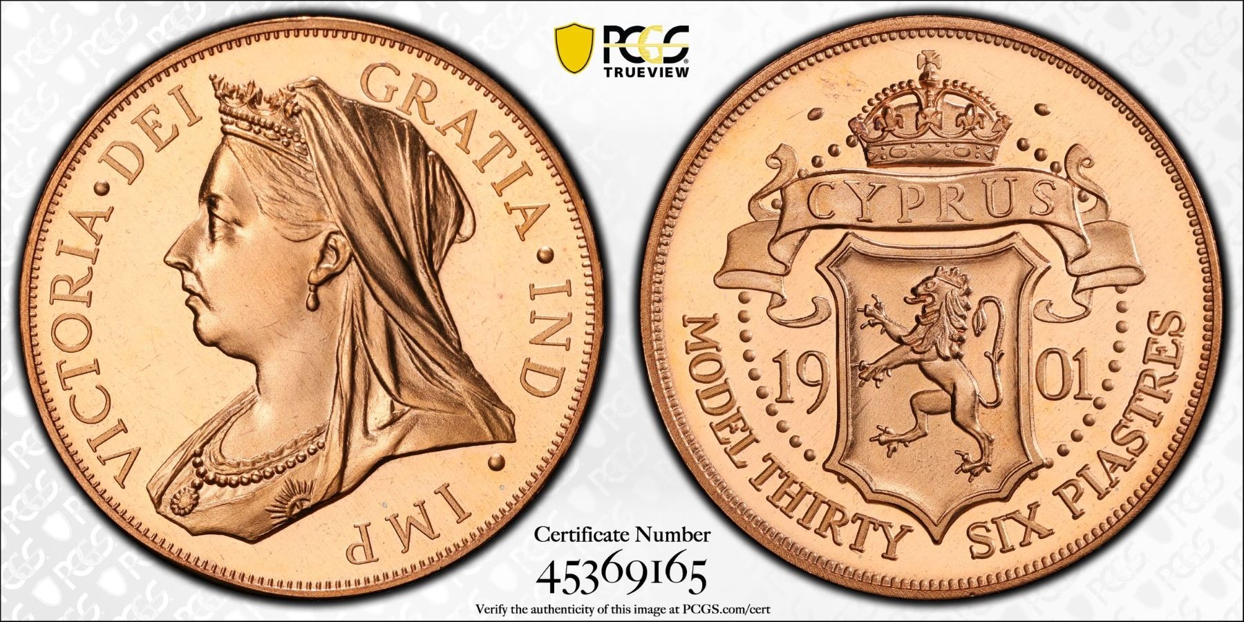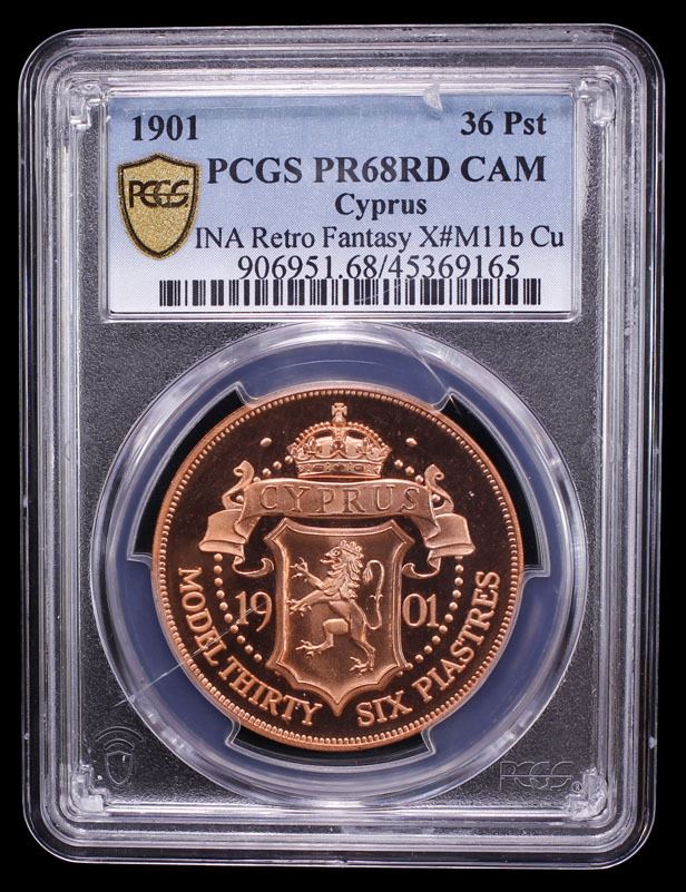 CYPRUS: Fantasy Issues, 36 piastres, "1901", KM-M11b, INA Retro Fantasy "Veiled Head" type of Victoria, struck in copper, International Numismatic Agency(INA) issue, PCGS graded PF68 Red Cameo. The International Numismatic Agency (INA) struck high quality fantasy British crown coins primarily around 2000–2001, with additional, subsequent strikings reported in 2007 and 2008. These coins are often referred to as "INA Retro Fantasy Issues."