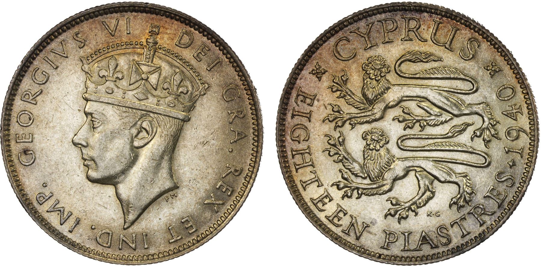CYPRUS: George VI, 1936-1952, AR 18 piastres, 1940, AU