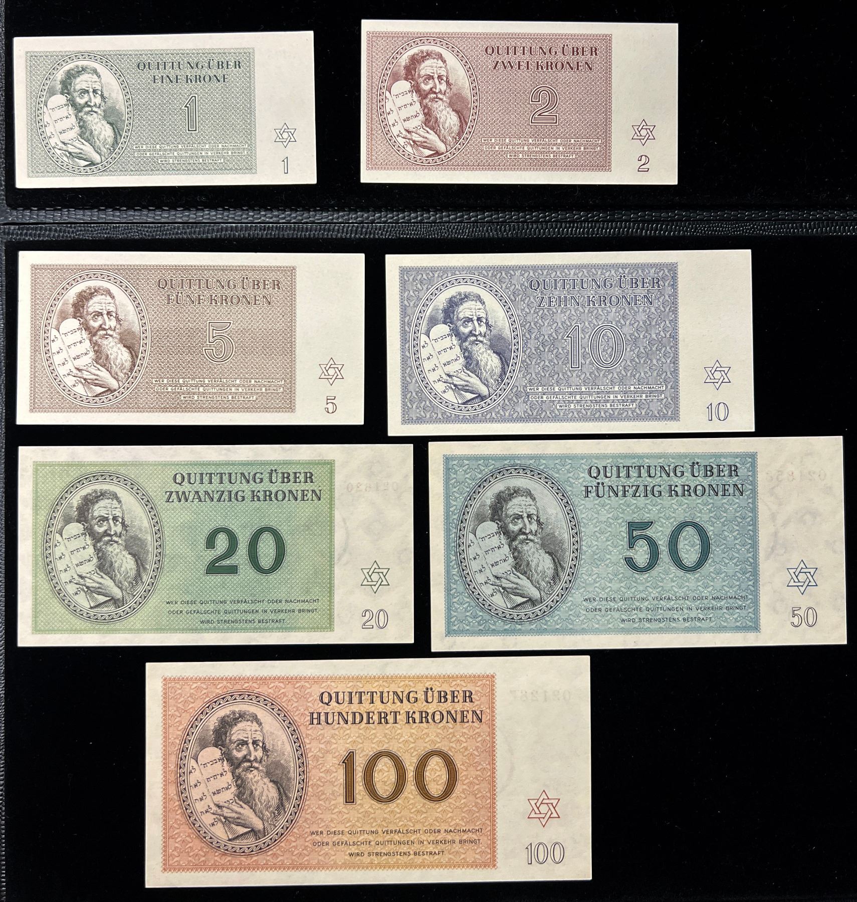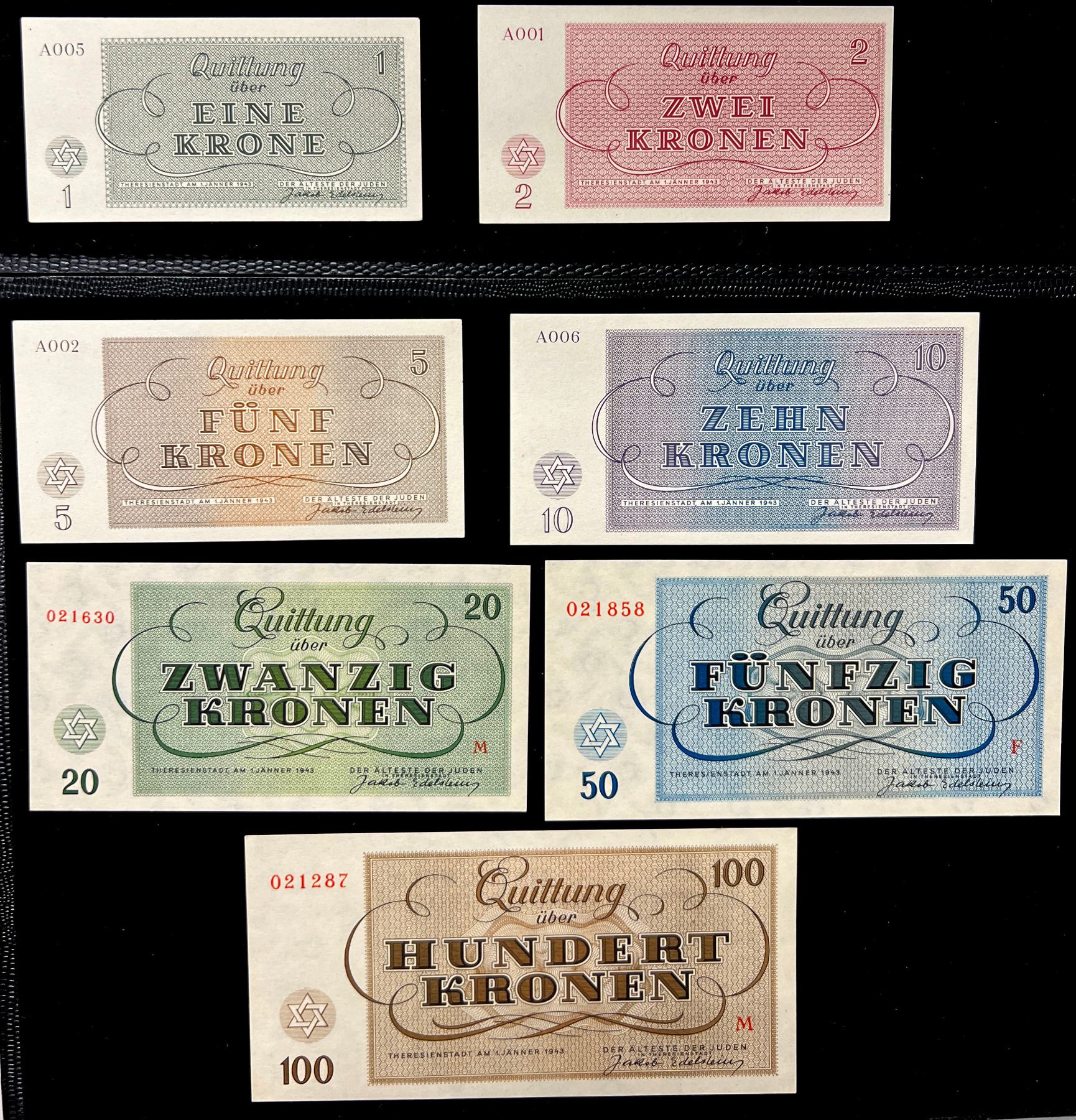 CZECHOSLOVAKIA: Theresienstadt/Litzmannstadt (Poland), SET of 7 notes, 1.1.1943, Campbell-4111 through 4117, Schwan & Boling-701 through 707, Ghetto issue, set of 7 notes, Choice UNC, ex Dr. Robert A. Rosenfeld Collection.
