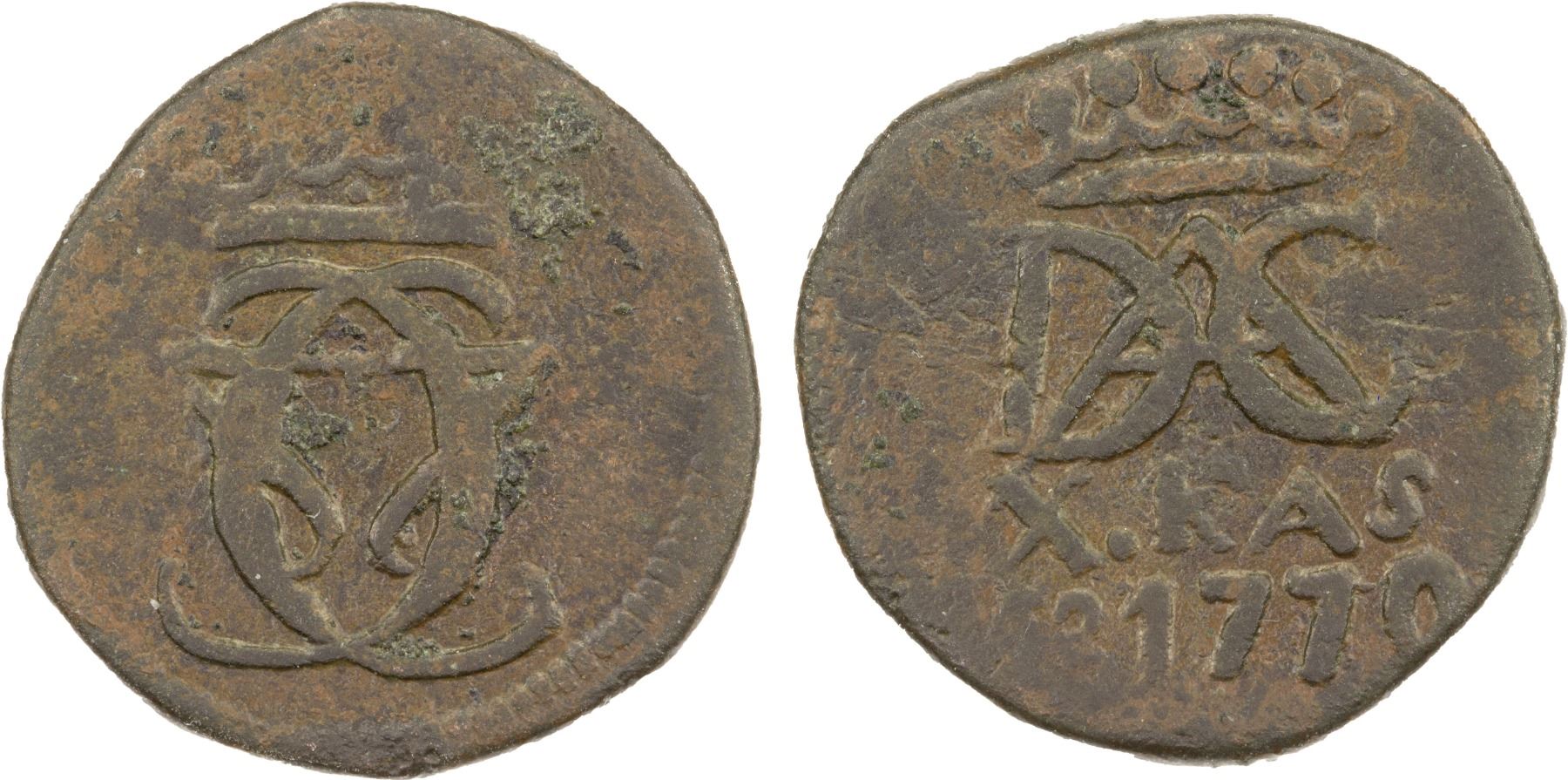 DANISH INDIA: Christian VII, 1766-1808, AE 10 kas (5.90g), Tranquebar, 1770, KM-164, Gray-147, Jensen-321, crowned DAC monogram, "X.KAS" and date below, light porosity, lovely strike, VF, R.