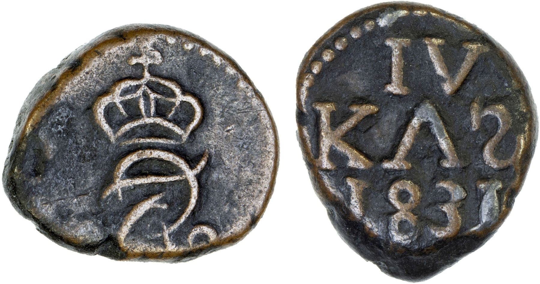 DANISH INDIA: Frederik VI, 1808-1839, AE 4 kas (2.44g), Tranquebar, 1831, Gray, Jensen-382, mint error: retrograde S in KAS, very rare date for this error, strong VF, RRR.