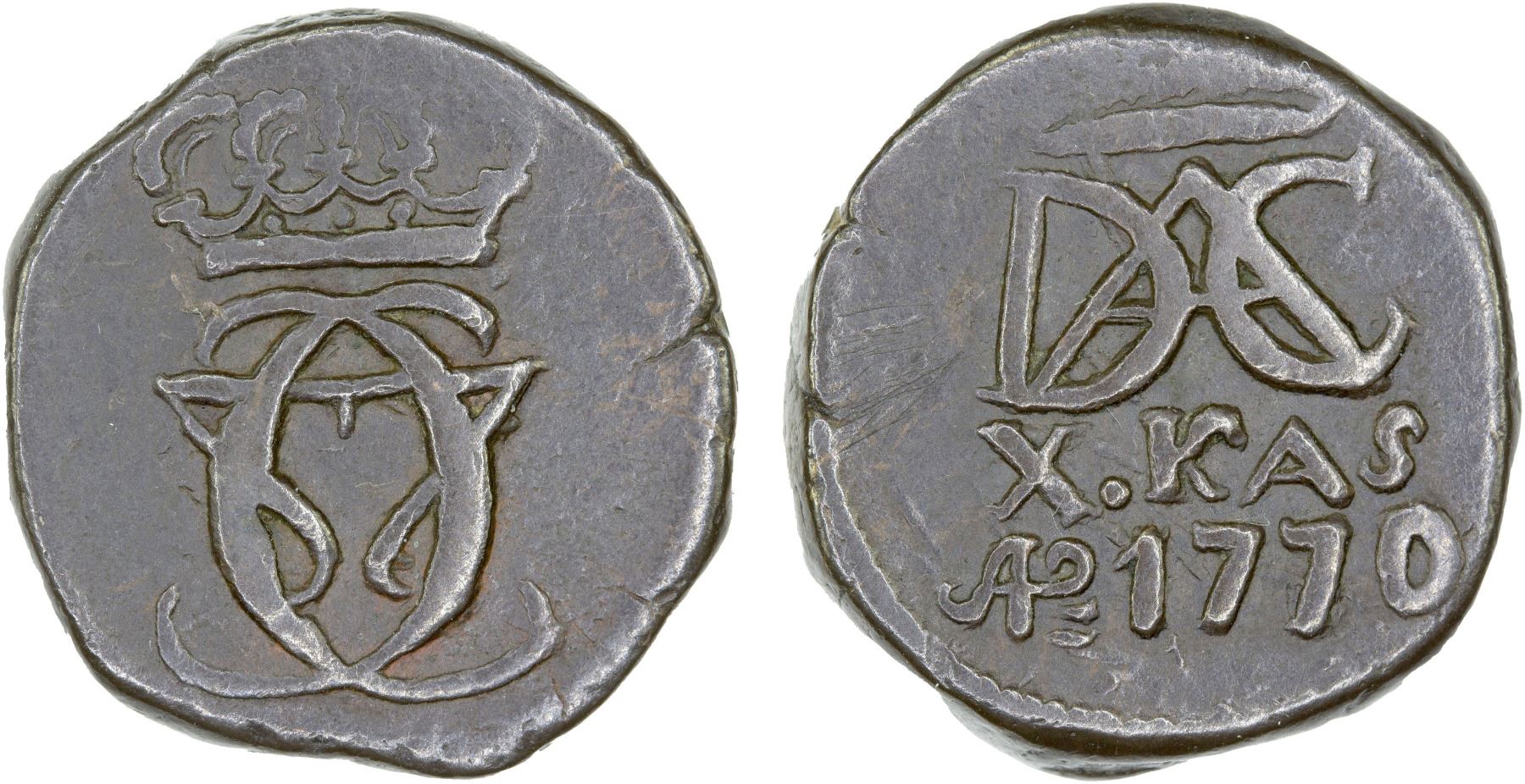 DANISH INDIA: TRANQUEBAR: Christian VII, 1766-1808, AE 10 kas (6.59g), 1770, KM-164, Gray-147, Jensen-321, crowned DAC monogram, "X.KAS" and date below, bold strike, choice VF, R, ex Solar Collection.