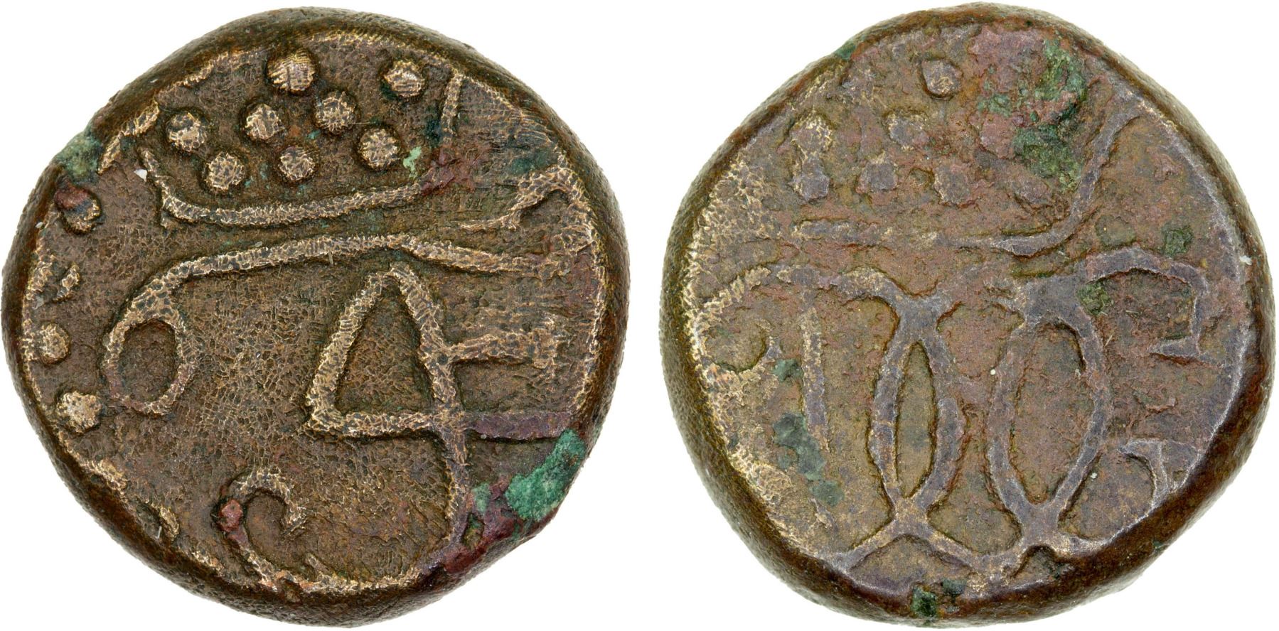 DANISH INDIA: TRANQUEBAR: Frederick IV, 1699-1730, AE kas (1.15g), ND, KM-124, Gray-118, Jensen-208, crowned F4 with one vertical stem // crowned DOC monogram, F-VF, ex Solar Collection.