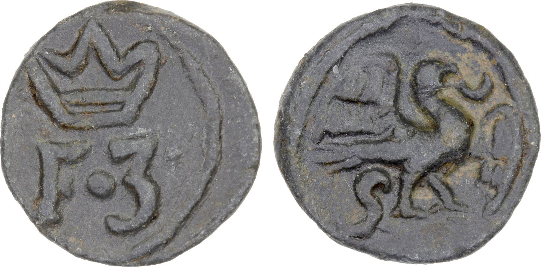 DANISH INDIA: TRANQUEBAR: Frederik III, 1648-1670, lead kas (2.28g), ND, KM-89, Gray-86a, Jensen-116, crowned F3 // swan right, with worm in its beak and letter S at lower left, XF, RR, ex Solar Collection.