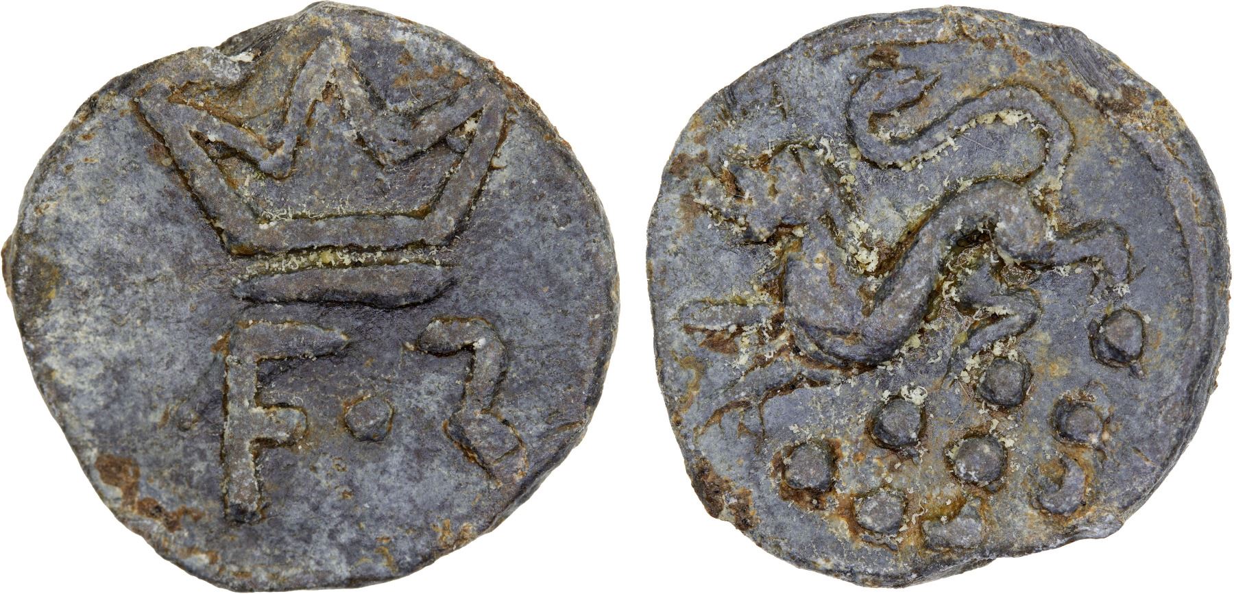 DANISH INDIA: TRANQUEBAR: Frederik III, 1648-1670, lead kas (2.65g), ND, KM-85, Gray-82, Jensen-113, crowned F3 // Gothic lion to left, nine hearts below (emblem of Jutland), choice VF, R, ex Solar Collection.