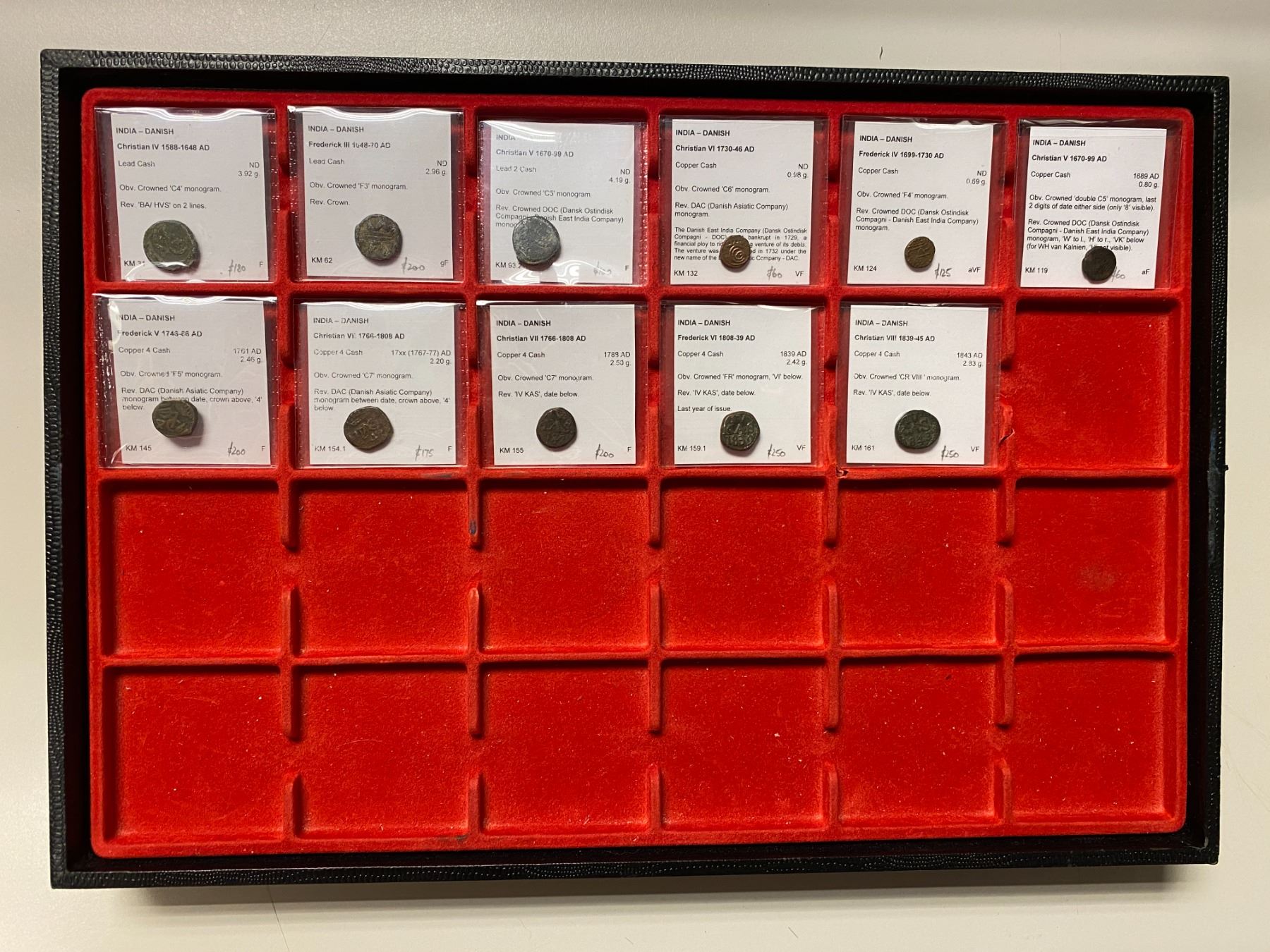 DANISH INDIA: Tranquebar, LOT of 11 coins, All kings represented: Lead cons of Chritian IV (KM-31), Frederick III (KM-52), Christian V (KM-93.2); and Copper: Christian V (KM-119, 1689), Frederick IV (KM-124), Christian VI (KM-132), Frederick V (KM-145, 1761), Christian VII (KM-154.1, 17xx, and KM-155, 1788), Frederick VI (KM-159.1, 1839), and Christian VII (KM-161, 1843); early date mostly VG conditoin, later dates at least Fine, last three coins each VF) all with Ian Todd's description; retail value $550, lot of 10 pieces.