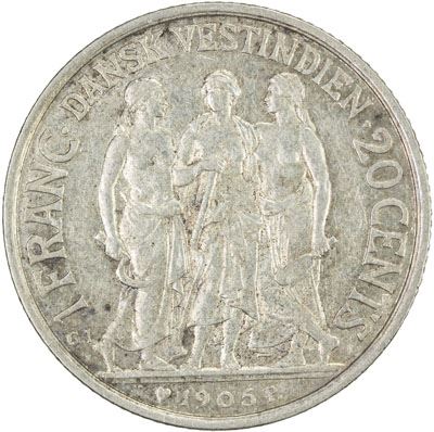DANISH WEST INDIES: Christian IX, 1863-1906, AR 20 cents, 1905, KM-79, Sieg-33, Hede-39, one-year type, light tone, EF, ex Dr. John Lund Collection.