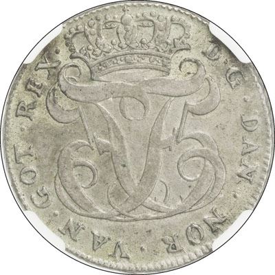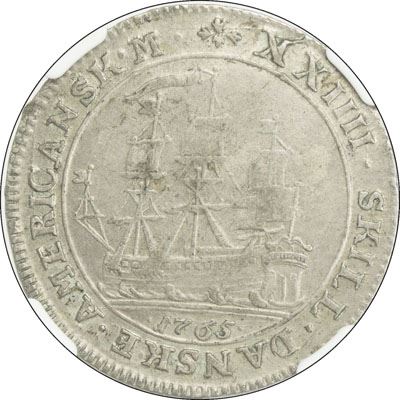 DANISH WEST INDIES: Frederik V, 1746-1766, AR 24 skilling, 1765, KM-9, with titles as "King of Denmark and Norway, the Wends and the Goths", NGC graded EF45, ex Dr. John Lund Collection.