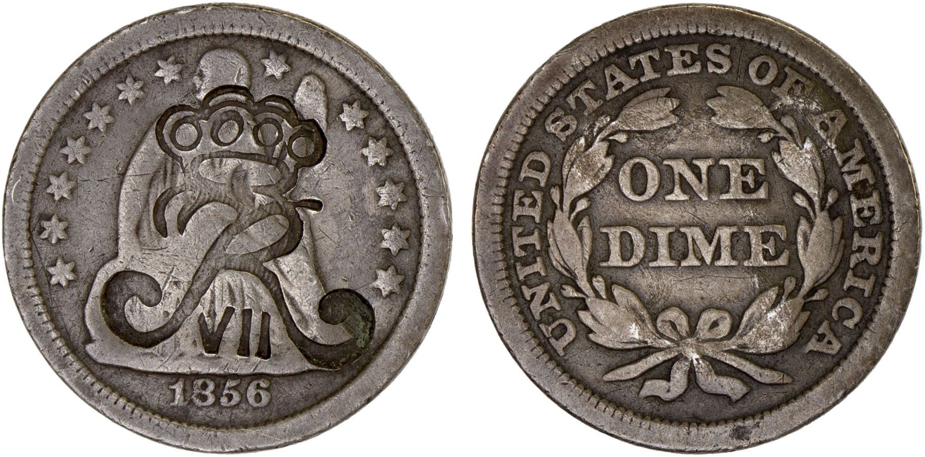 DANISH WEST INDIES: Frederik VII, 1848-1863, AR 10 cents, ND (1850), cf. Bruce-X24/X28, crowned FRVII countermark on 1856 small date U.S. dime (KM-A63.2, Ahwash-pg. 137), countermark fairly well struck, VF on VG host. These are thought to be spurious countermarks, but remain popular.