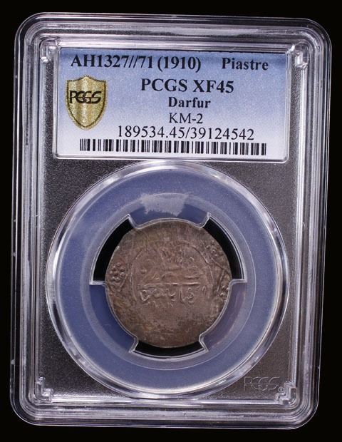 DARFUR: Ali Dinar, 1898-1916, BI piastre, AH1327/71, KM-2, much better than usually seen, with more of the design visible than normally found, attractive light tone, PCGS graded EF45, ex The 1914 Collection. Finest graded by PCGS.
