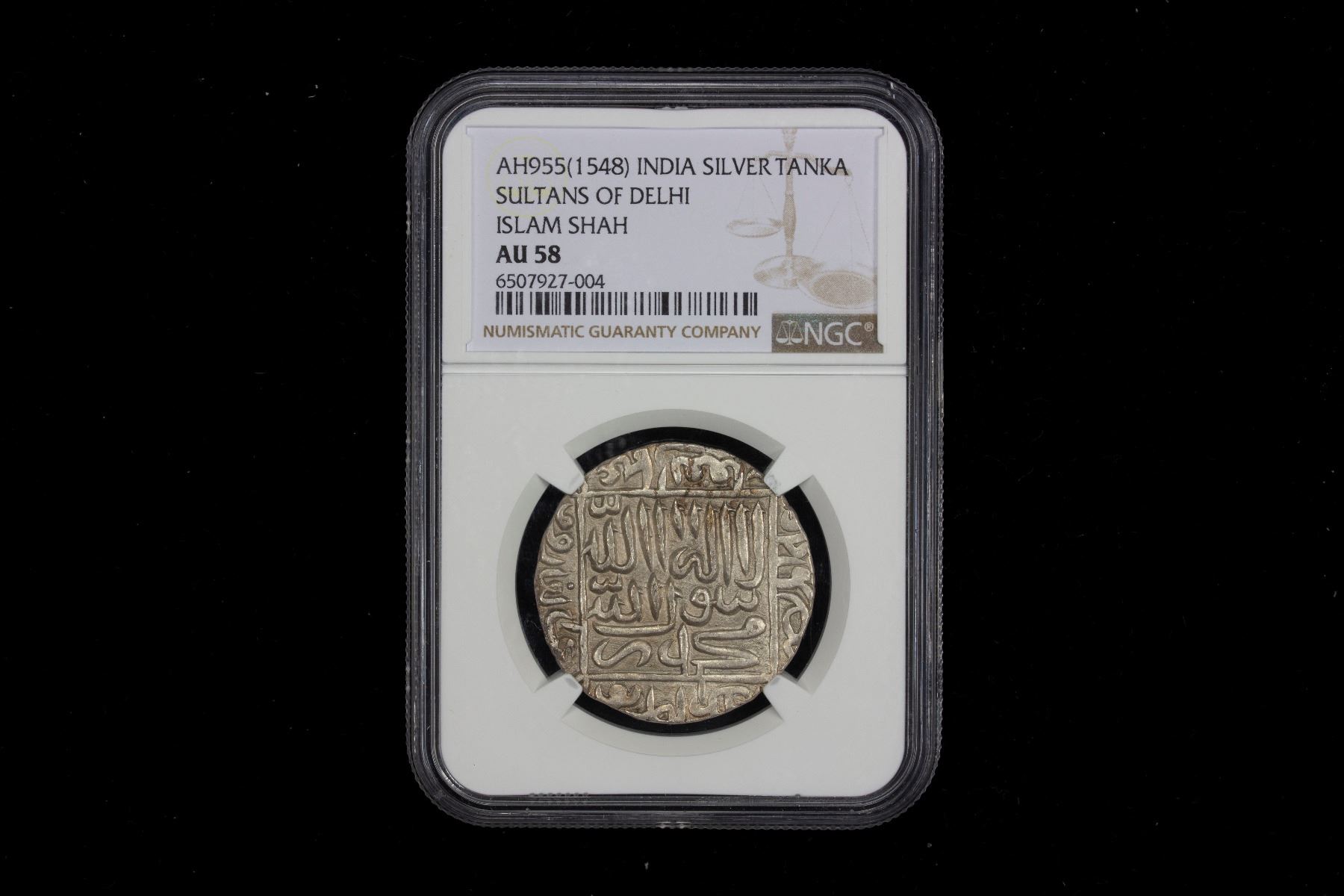 DELHI: Islam Shah, 1545-1552, AR tanka, NM, AH955, G-D980, with the peculiar number 1477 above the obverse, common type known for all dates AH952-960, beautiful strike almost perfectly centered, NGC graded AU58.