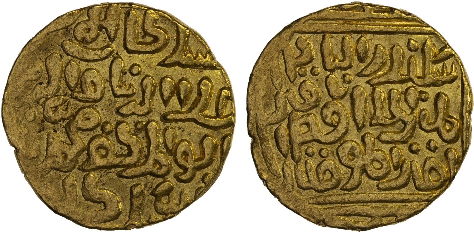 DELHI: Muhammad II, 1296-1316, AV tanka (10.86g), NM, ND, G-, contemporary or early posthumous imitation, generally as type D220-D222, but reverse has 2nd part of the royal text partly in a square, fine gold, VF.