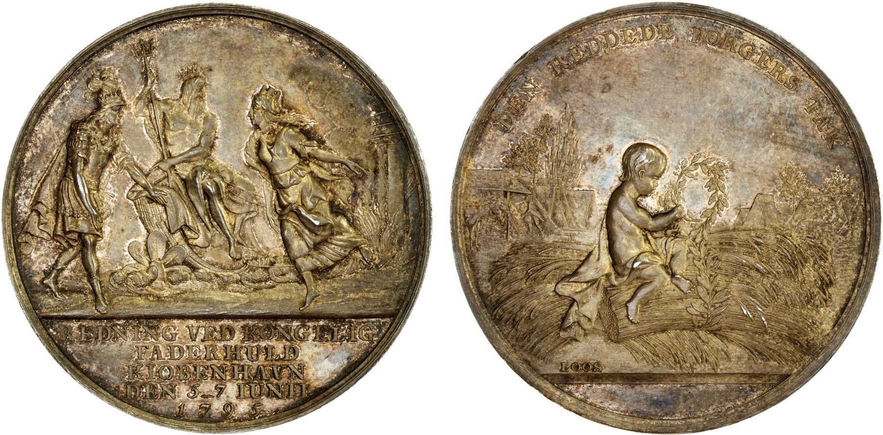 DENMARK: AR medal (14.23g), 1795, Bergsöe-12, Sommer-A 49, 36mm silver medal for the Great Fire of Copenhagen by Loos, personification of the city rushes to seek help from the god of the sea with Crown Prince arriving to help at left with "REDNING VED KONGELIG / FADERHULD / KIOBENHAVN / DEN 5-7 IUNII / 1795" in exergue // young boy seated on sheaf winding an oak wreath with buildings behind and DEN REDDEDE BORGERS TAK around, a few hairlines, nicely toned, plain edge, AU.