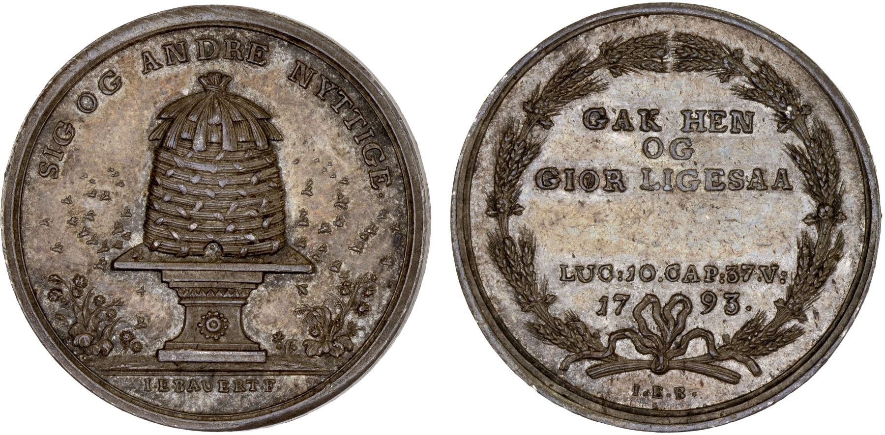 DENMARK: AR medal (6.93g), 1793, Bergsöe-7, Spiegel-2380var, 27mm silver award medalet for Diligence at the Military Schools by J. E. Bauert, beehive on pedestal surrounded by flying bees, with flowers at base and SIG OG ANDRE NYTTIGE around // "GAK HEN / OG / GIOR LIGESAA / LUC:10.CAP:37.V; / 17 - 93", all within wreath of grain, natural tone, very rare, plain edge, XF-AU. In searching for other examples, we were only able to locate one other piece, in bronze.