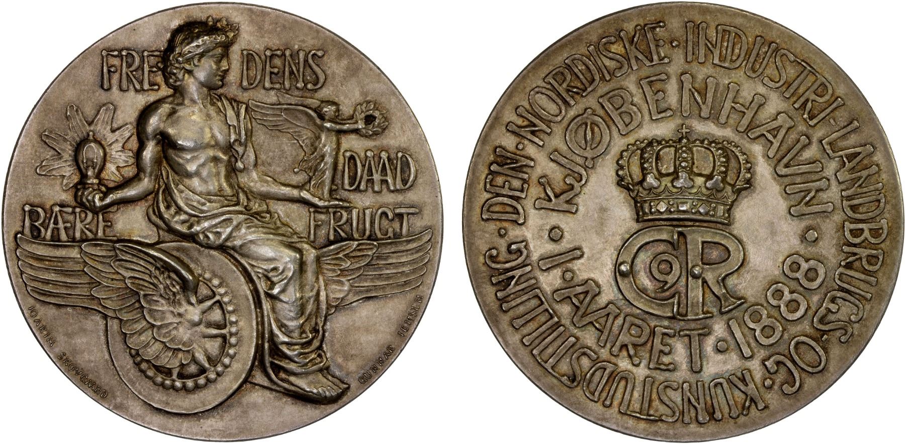 DENMARK: AR medal (75.91g), 1888, 51mm silver medal for the Nordic Industrial, Agricultural, and Art Exhibition in Copenhagen by Ioakim Skogaard and Gunnar Iensen, draped laureate male figure with radiant electric light in right hand and Victory presenting laurel wreath in left hand, seated in winged wheel throne with legend FRE - DENS / DAAD / BAERE - FRUCT ("The act of peace bears fruit") at sides // crowned C9R monogram with "DEN NORDISKE INDUSTRI-LANDBRUGS-OG KUNSTUDSTILLING / KJØBENHAVN - I AARET 1888" around, lightly toned, DALE FABRIKER on edge, AU.