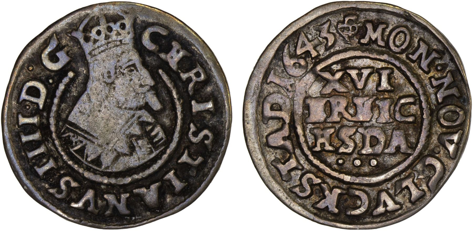 DENMARK: Christian IV, 1588-1648, AR 3 skilling lybsk (1.65g), Glückstadt, 1643, Sieg-170.2, H-176A, Fine.