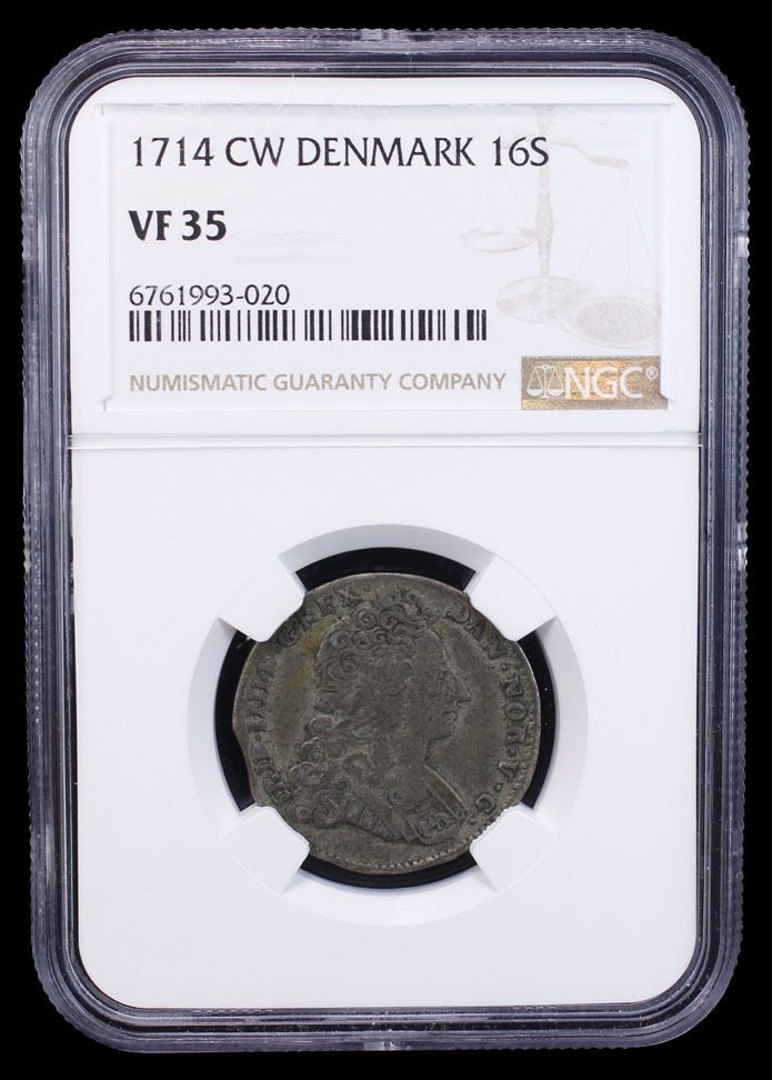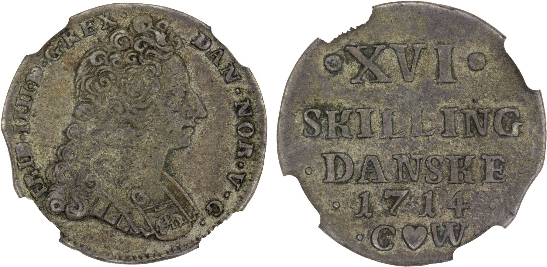 DENMARK: Frederik IV, 1699-1730, AR 16 skilling, 1714, KM-505, initials CW, tiny clip at 8:30, NGC graded VF35.