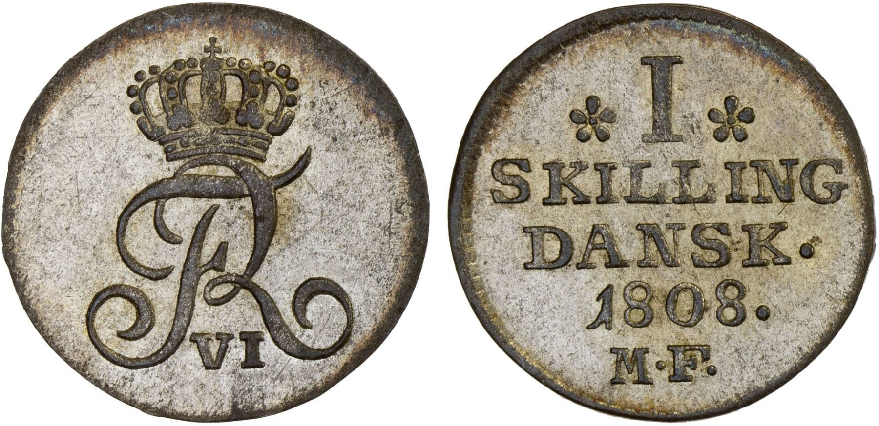 DENMARK: Frederik VI, 1808-1839, AR skilling, Altona, 1808 MF, KM-662, faint wiping, choice AU.