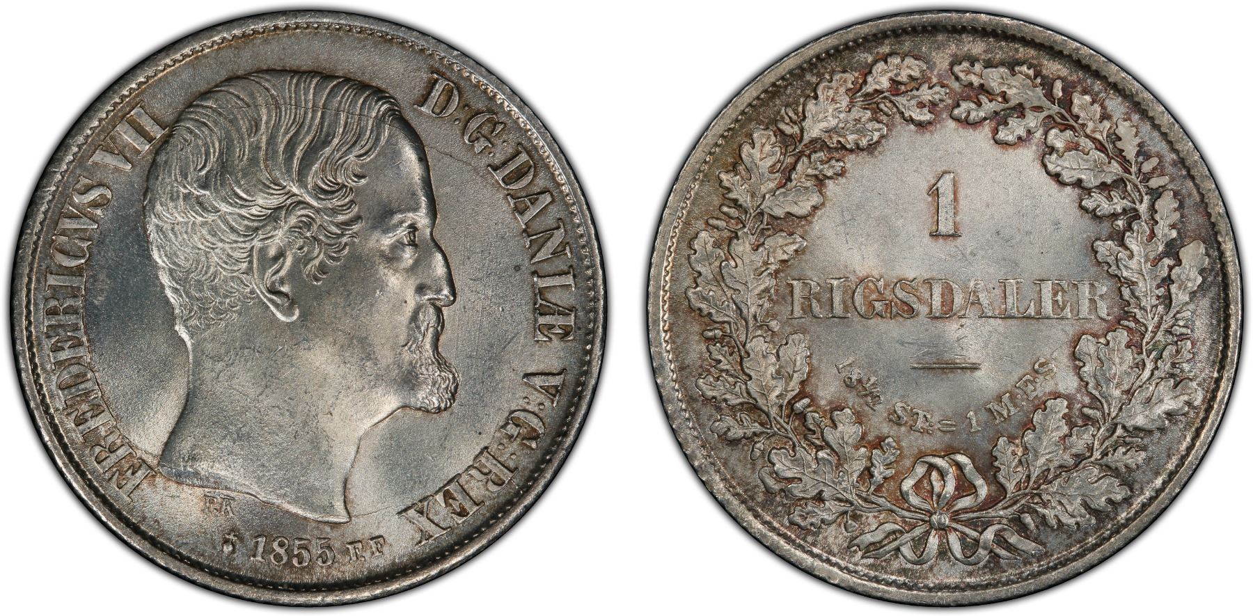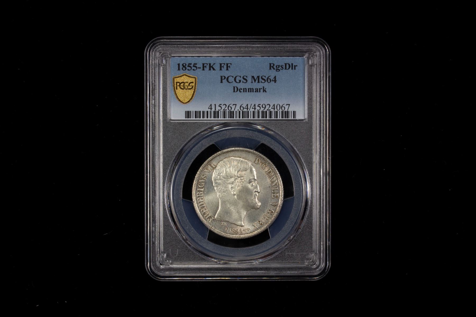 DENMARK: Frederik VII, 1848-1863, AR rigsdaler, 1855, KM-760.2, mintmaster Johann Friedrich Freund, one-year type, PCGS graded MS64.