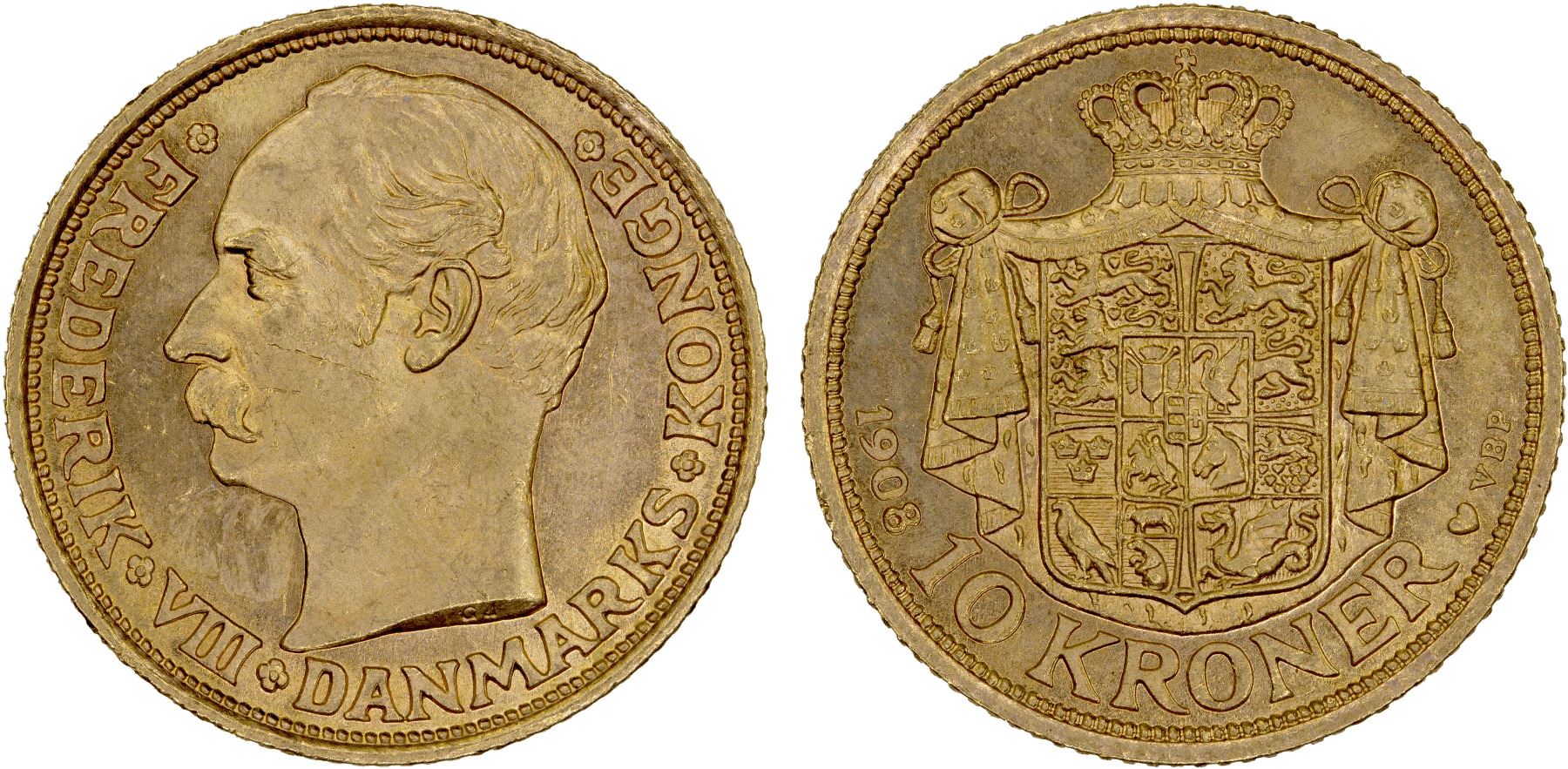 DENMARK: Frederik VIII, 1906-1912, AV 10 kroner, 1908, Choice UNC