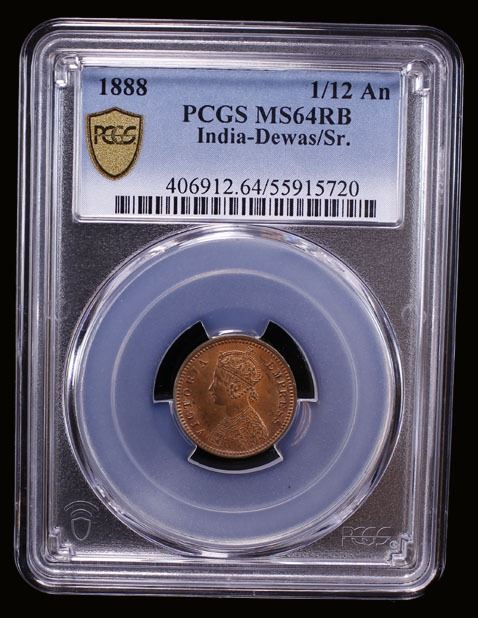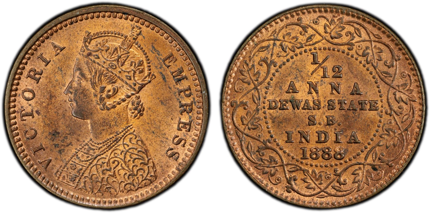 DEWAS SENIOR BRANCH: Victoria, Empress, 1876-1901, AE 1/12 anna, 1888(c), KM-11, a stunning example with much red present and with great eye appeal, PCGS graded MS64 RB. Tied with only one other example for highest graded (Top Pop) at PCGS.