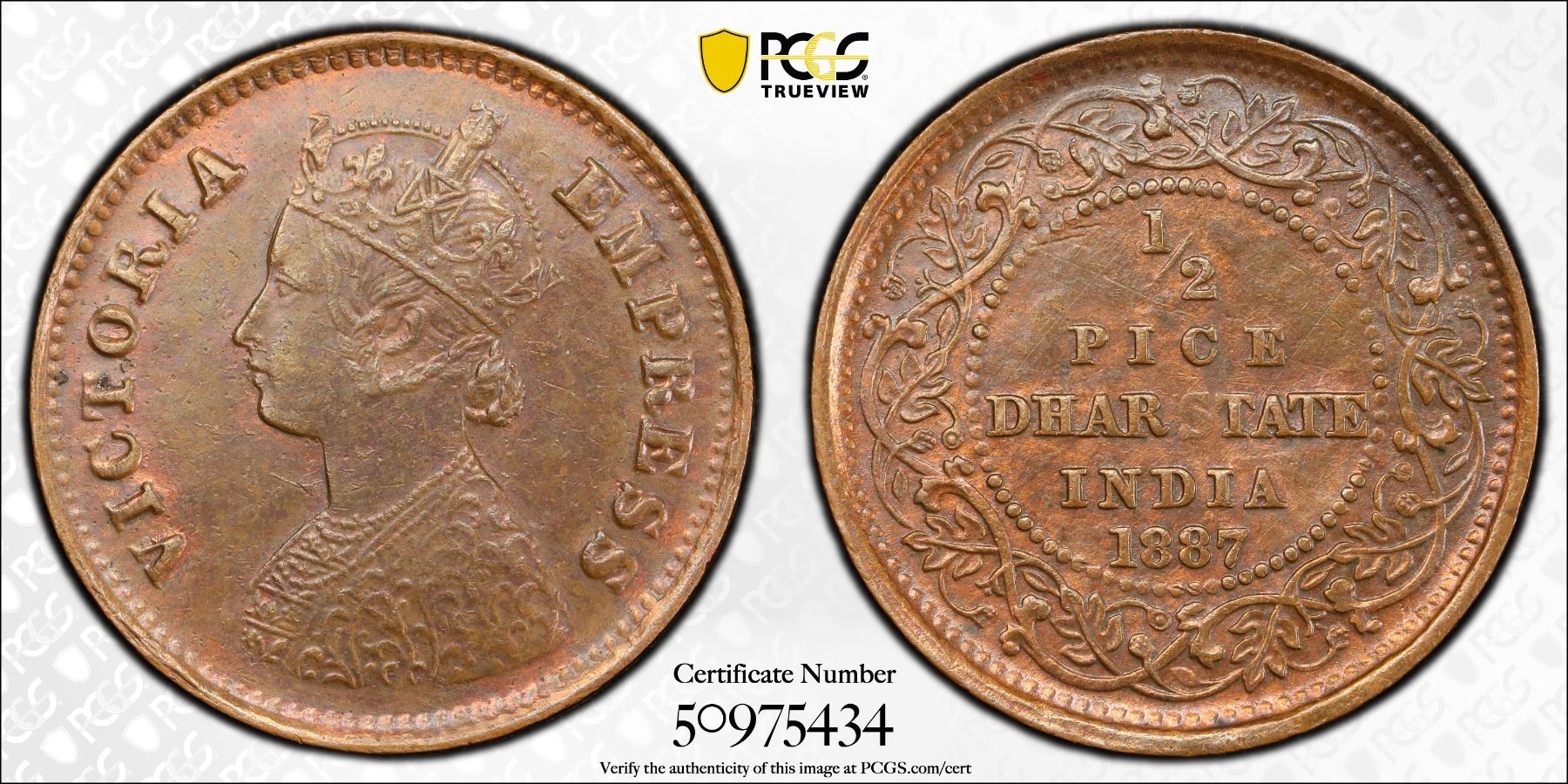 DHAR: Anand Rao, 1860-1898, AE 1/2 pice, 1887, KM-12, regal type of Victoria as Empress, cleaned, PCGS graded UNC details.