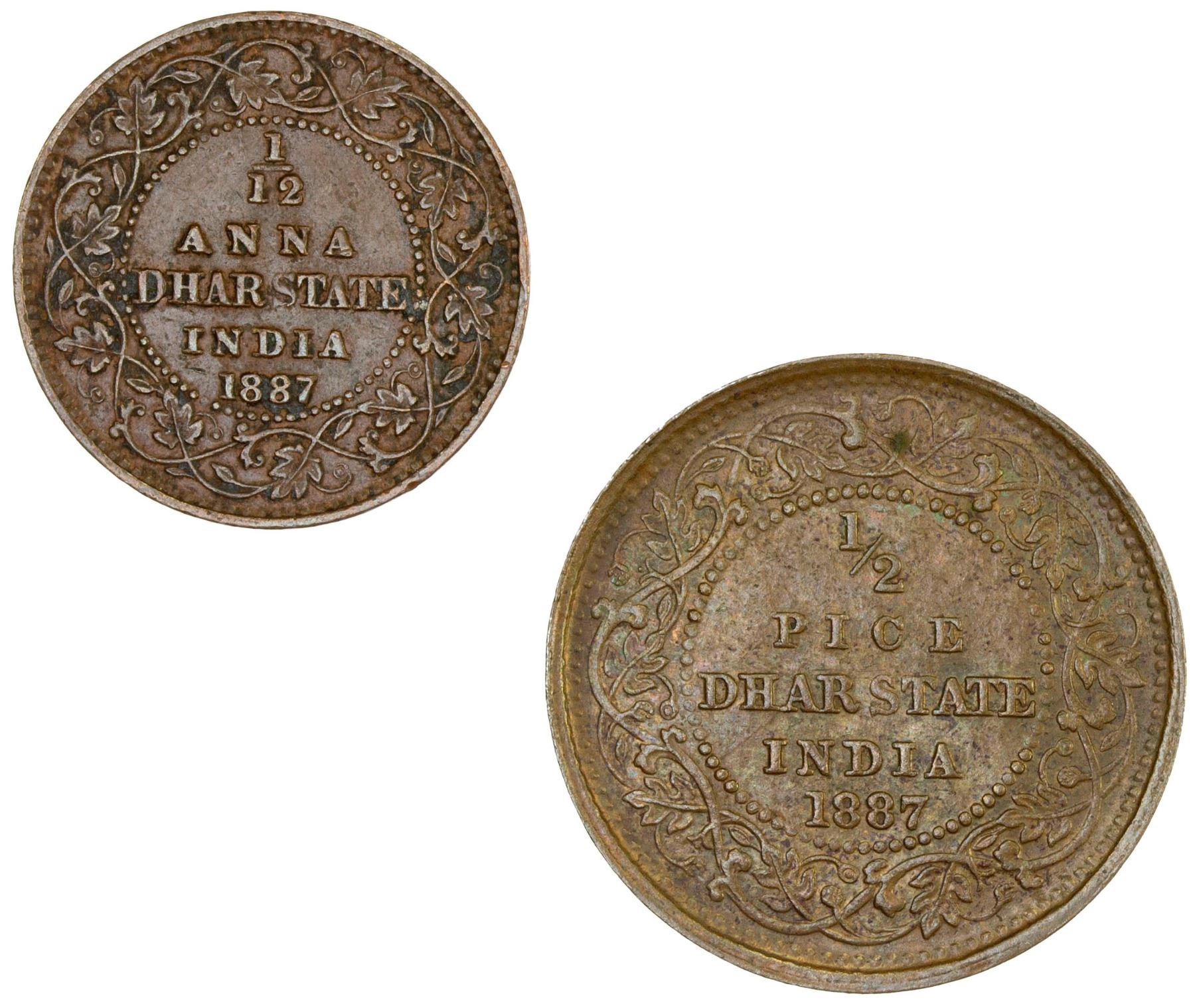 DHAR: Victoria, Empress, 1876-1901, LOT of 2 coins, 1887, including a 1/2 pice (KM-12, EF) and a 1/12 anna (KM-11, VF-EF), accompanied by collector's information card; retail value $120, lot of 2 pieces, ex Anton Holt Collection.