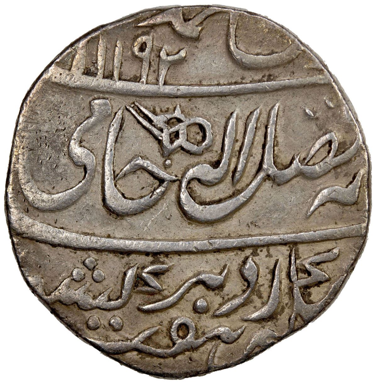 DHOLPUR: AR rupee (10.98g), Gohad, AH1192 year 24, Cr-5.1, in the name of Shah Alam II, inverted pistol in obverse center, VF-EF, RR, ex K. W. Wiggins Collection. The regnal year 24 would match with AH1196, so the "2" of 1192 is likely a retrograde "6", a common die-cutter's error.
