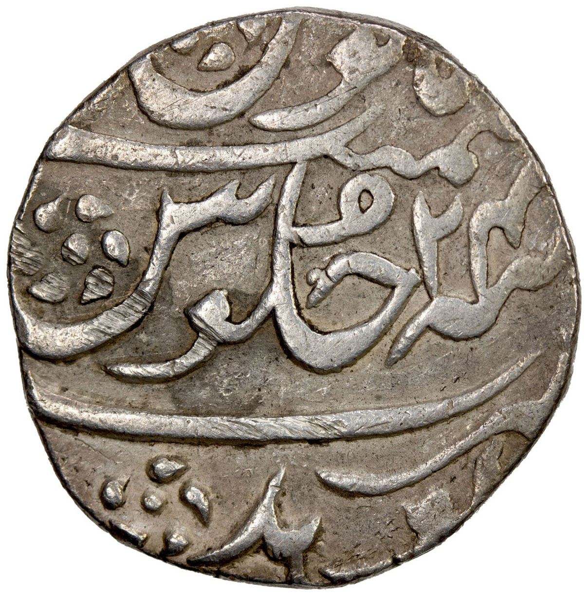 DHOLPUR: AR rupee (10.98g), Gohad, AH1192 year 24, Cr-5.1, in the name of Shah Alam II, inverted pistol in obverse center, VF-EF, RR, ex K. W. Wiggins Collection. The regnal year 24 would match with AH1196, so the "2" of 1192 is likely a retrograde "6", a common die-cutter's error.