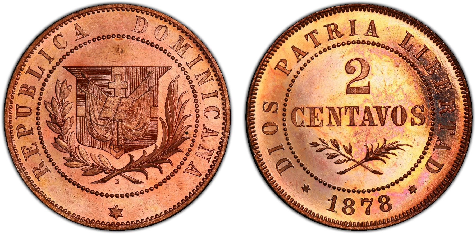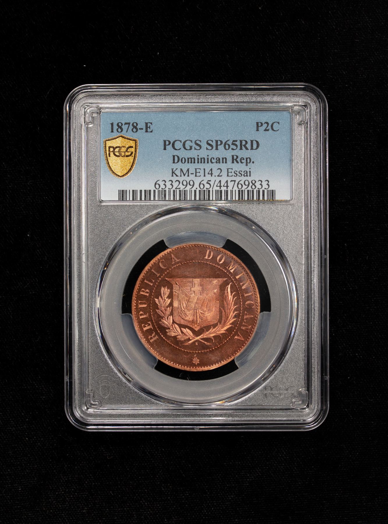 DOMINICAN REPUBLIC: AE 2 centavos, 1878, KM-E14.2, specimen essai strike and a superb quality red lustrous example! PCGS graded Specimen 65 RD.