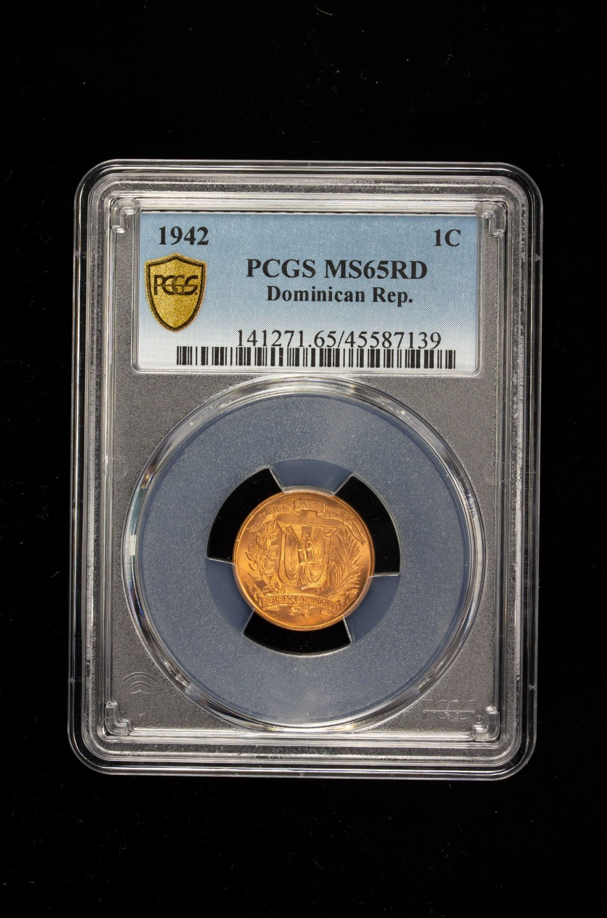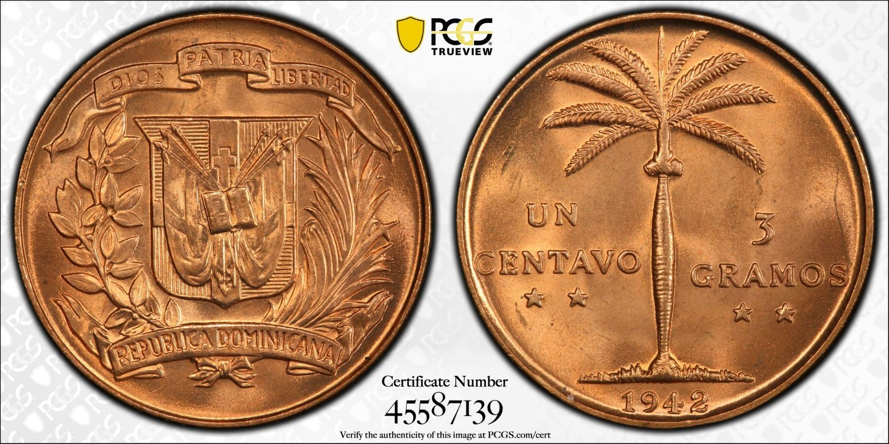 DOMINICAN REPUBLIC: AE centavo, 1942, KM-17, struck at the United States Mint, Philadelphia, a superb red lustrous example! PCGS graded MS65 RD.