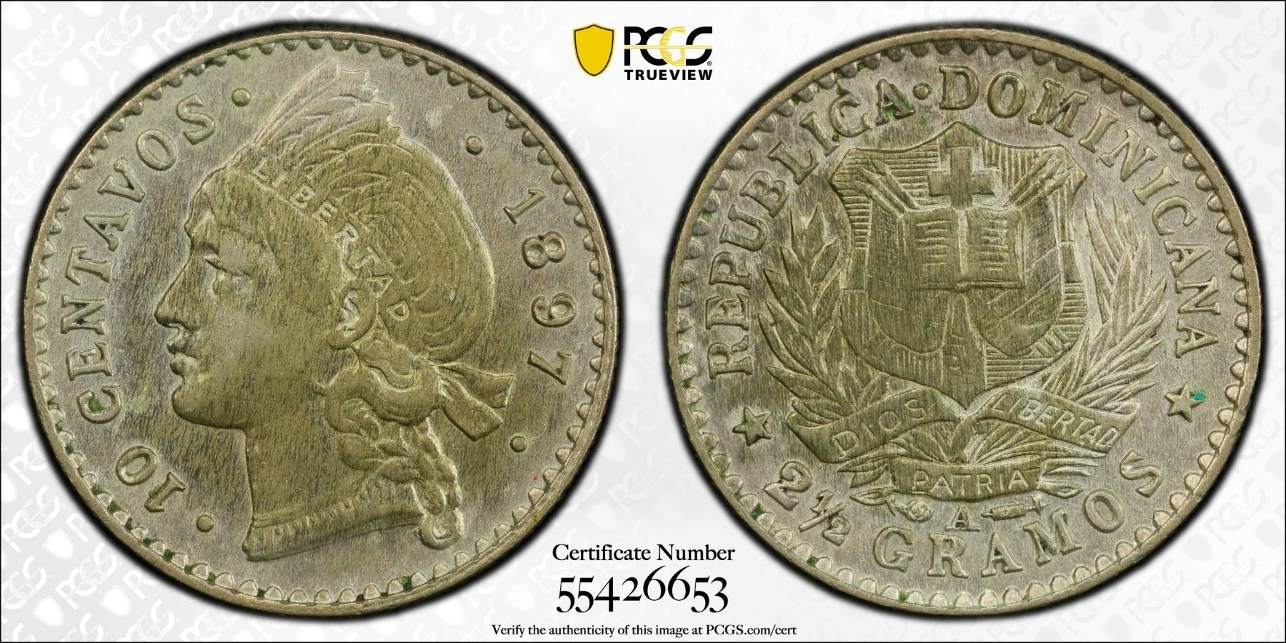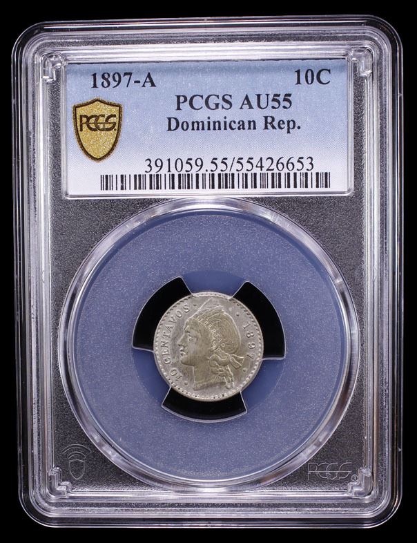 DOMINICAN REPUBLIC: BI 10 centavos, 1897-A, KM-13, Paris Mint, PCGS graded AU55.