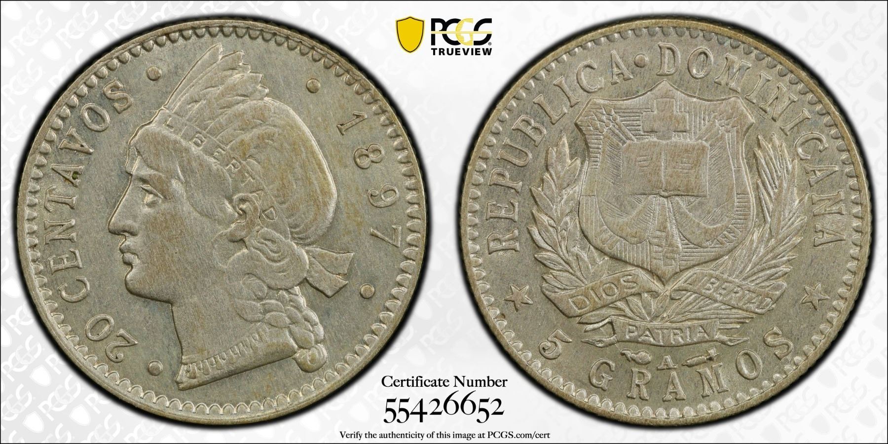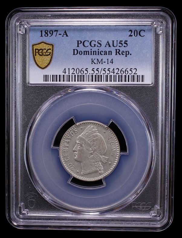 DOMINICAN REPUBLIC: BI 20 centavos, 1897-A, KM-14, Paris Mint, PCGS graded AU55.