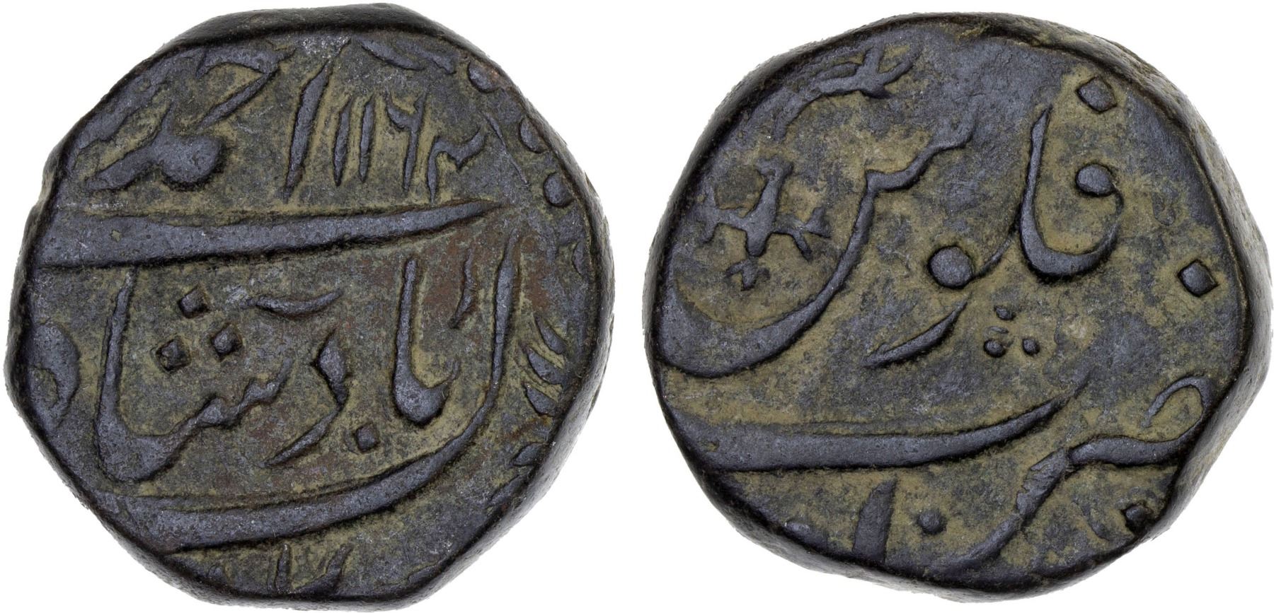 DURRANI: Ahmad Shah, 1747-1772, AE dam (paisa) (13.04g), Peshawar, AH1162, A-3095, KM-690, with cross above the letter "S" of jalus, choice VF, RR.