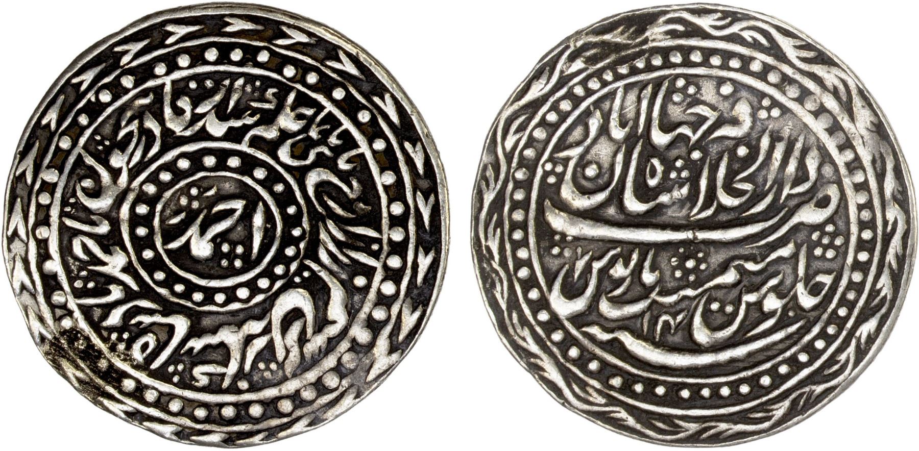 DURRANI: Ahmad Shah, 1747-1772, AR nazarana mithqal (4.54g), Shahjahanabad (Delhi), year 14, A-3092D, Zeno-142386 (= Whitehead-172, in the British Museum), ahmad in a triple circle in the obverse center, the rest of his couplet around // standard mint/date formula around; outer border of leaves on both sides; all 3 known example were struck from the same pair of dies and all are mount removed; this is the finest of the 3 examples, VF-XF, RRRR. The second known piece was sold in our Auction 48, lot 606. It seems likely that this type was intended to be worn by the chief Durrani and other individuals, perhaps for the celebration of the second Durrani conquest of Delhi.