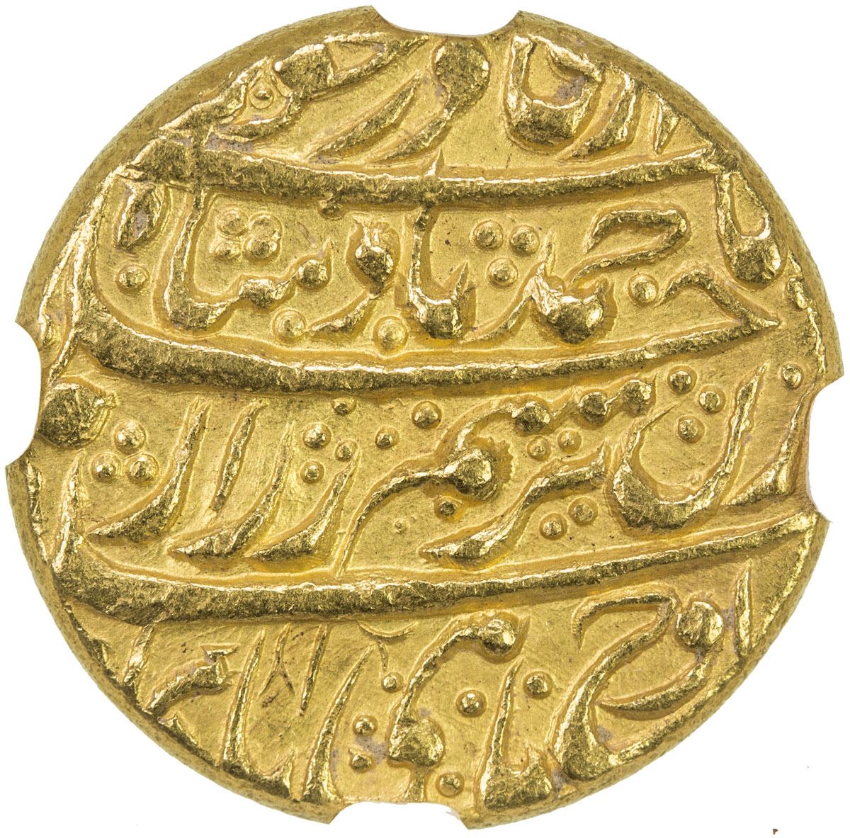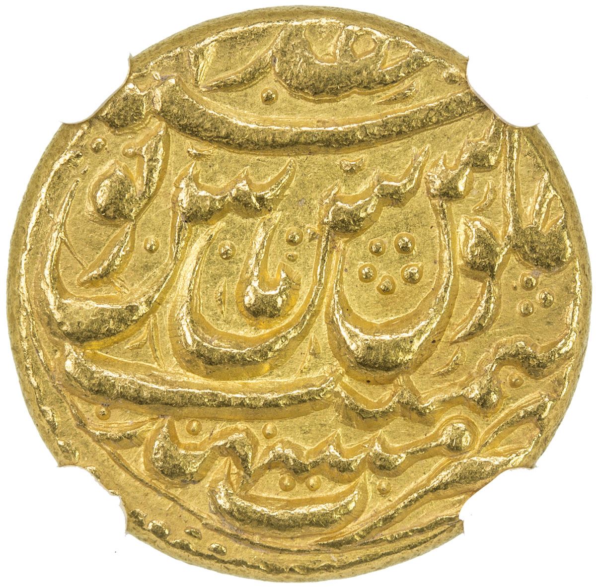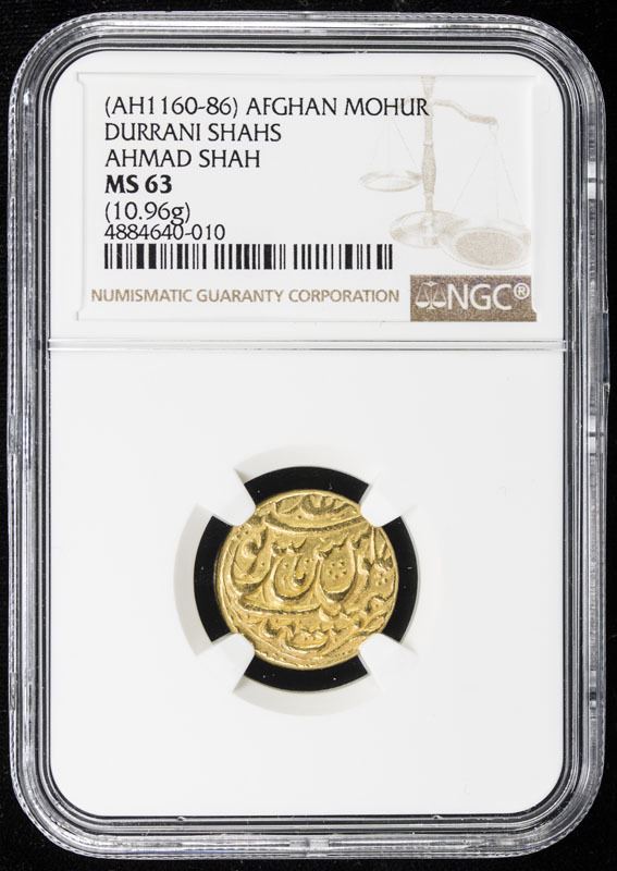 DURRANI: Ahmad Shah, 1747-1772, AV mohur (10.96g), Mashhad, ND, A-3090, KM-639, struck during the nominal reign of the Afsharid Shahrukh, but in the name of his protector, Ahmad Shah Durrani, NGC graded MS63.