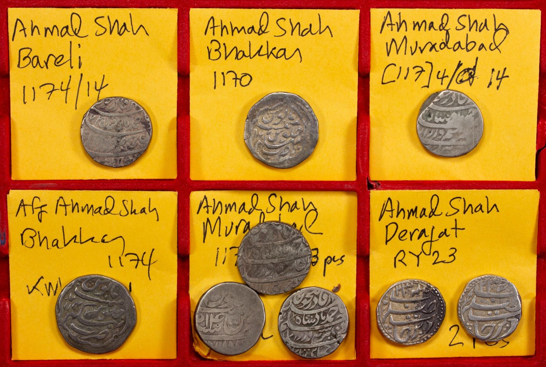 DURRANI: Ahmad Shah, 1747-1772, LOT of 9 silver rupees, type A-3092, including Bareli 1174/14, Bhakhar 1170 & 1174, Derajat year 23 (2 pcs), and Muradabad 1173/14 (3 pcs) and 1174/14; average Fine condition, but many weakness or some flat areas; retail value $300, lot of 9 pieces.